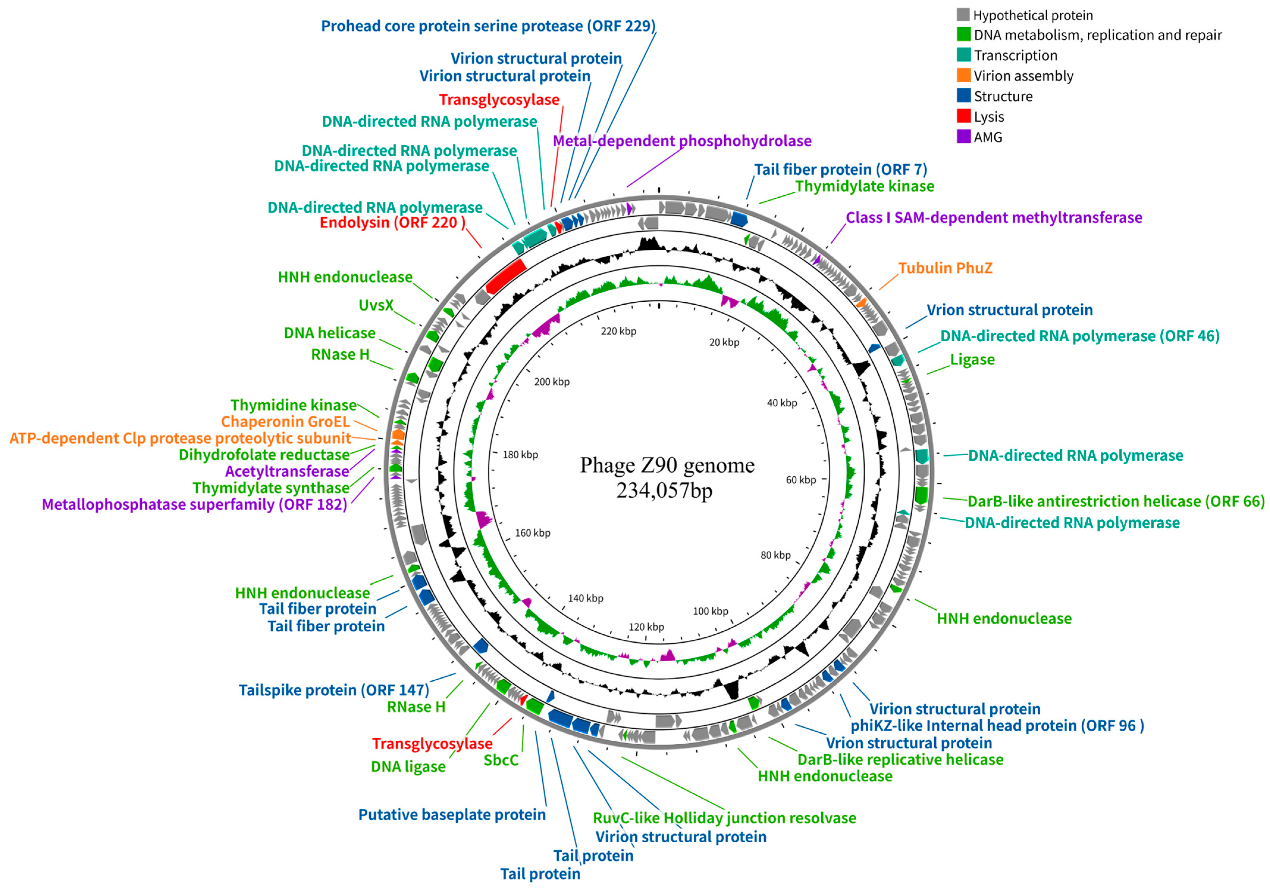 The phage Z90 genome consists of dsDNA of 234,057 bp, with 38.4% G + C content, indicating that it is a jumbo phage (>200 kb, Figure 3). It contains three putative tRNA-encoding genes and 242 ORFs, of which 50 were annotated with putative functions based on their amino acid sequence and conserved domains. The predicted functional ORFs were classified into different categories, including DNA metabolism and replication, transcription, virion assembly, structural proteins, lysis, and auxiliary metabolic genes (AMGs). Notably, the phage genome did not contain any known genes associated with virulence factors or antibiotic resistance.