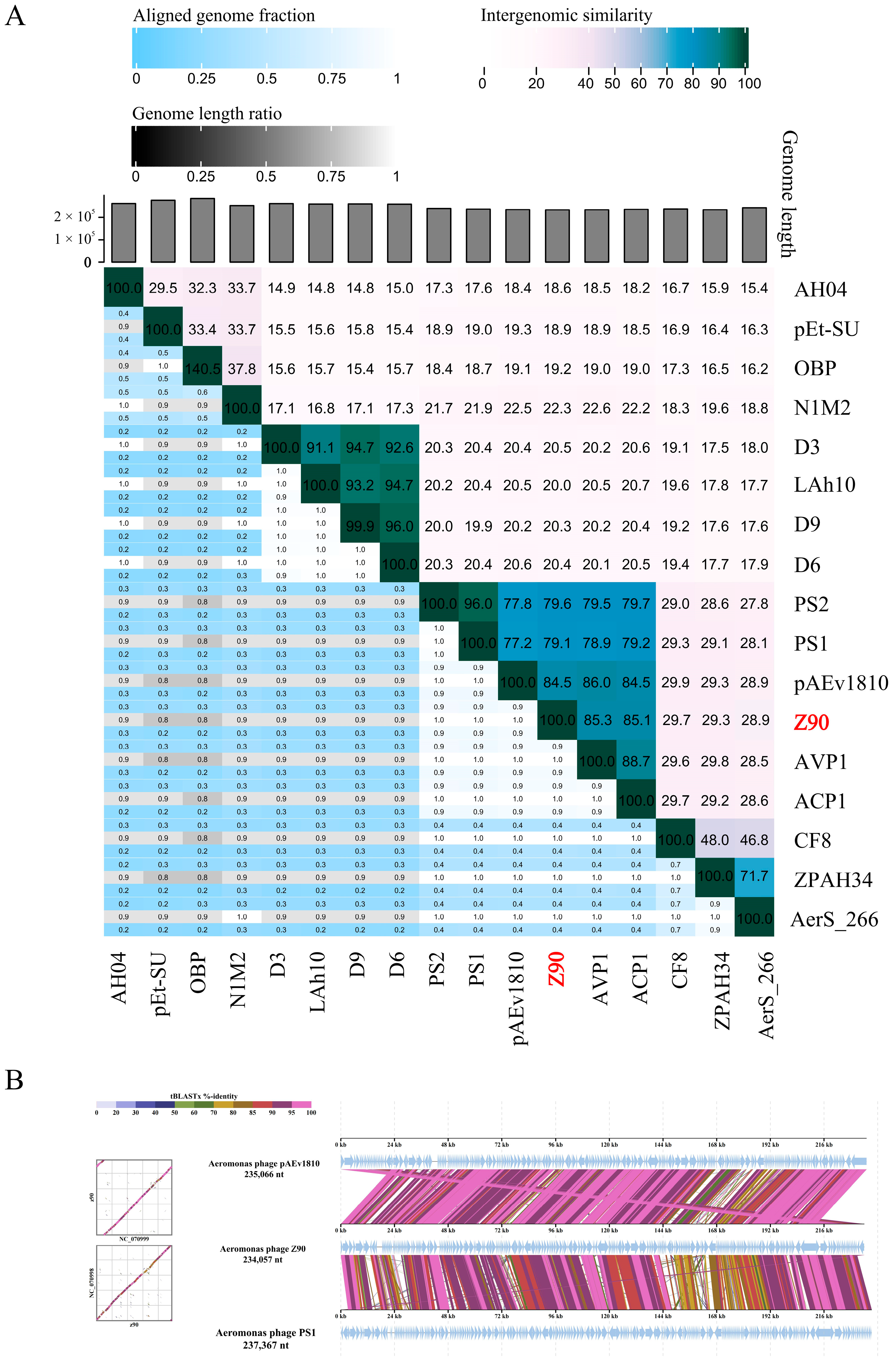 Intergenomic comparison of the phage Z90 and its related phages: (A) Intergenomic similarity between the phage Z90 and its related phages, calculated using VIRIDIC. (B) Genome comparison of the phage Z90, pAEv1810, and PS1.