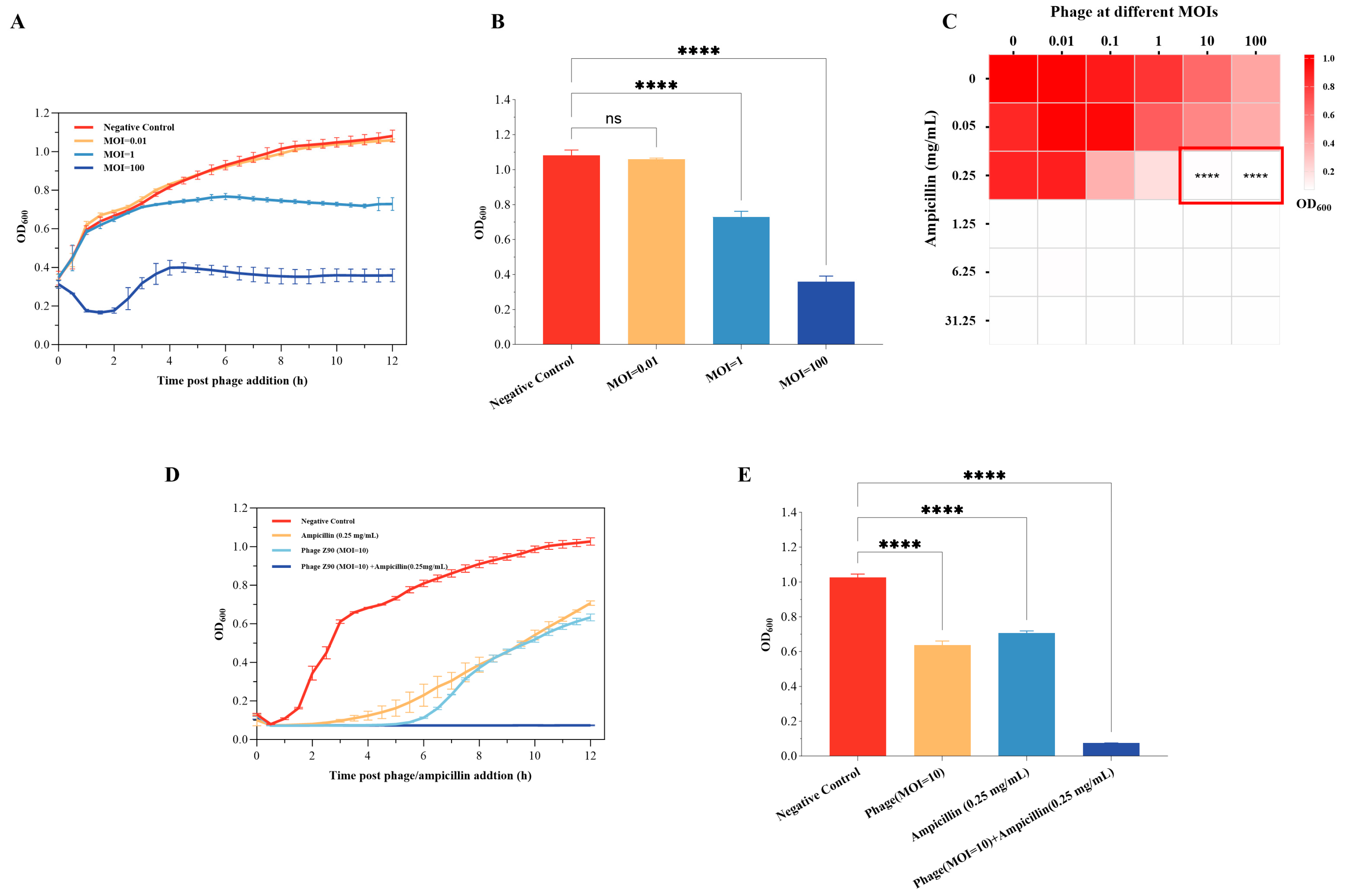 In vitro bactericidal effects of the phage Z90 against A. hydrophila 2408: (A) Killing curves showing the bactericidal effects of the phage Z90 against A. hydrophila 2408 at different MOIs. (B) The final OD600 values at 12 h post phage addition for different groups from panel (A). (C) Checkerboard screening assay showing the synergistic activities of the phage Z90 and ampicillin. Heatmap shows the OD600 values of the bacterial culture upon treatment with different combinations of the phage Z90 and ampicillin doses after 12 h of treatment. The red-outlined region indicates the combination treatments that achieved near-complete bacterial lysis (OD600 < 0.1). Statistical analysis revealed that these combination treatments significantly inhibited A. hydrophila 2408 compared with the blank control and each single treatment (**** p < 0.0001). (D) Killing curve showing the synergistic activity of the phage Z90 and ampicillin. (E) Final OD600 values at 12 h post phage/ampicillin addition for different groups from panel (D). Group differences were statistically assessed using one-way ANOVA followed by Tukey’s post-hoc multiple comparison test. ns = not significant; **** p < 0.0001.