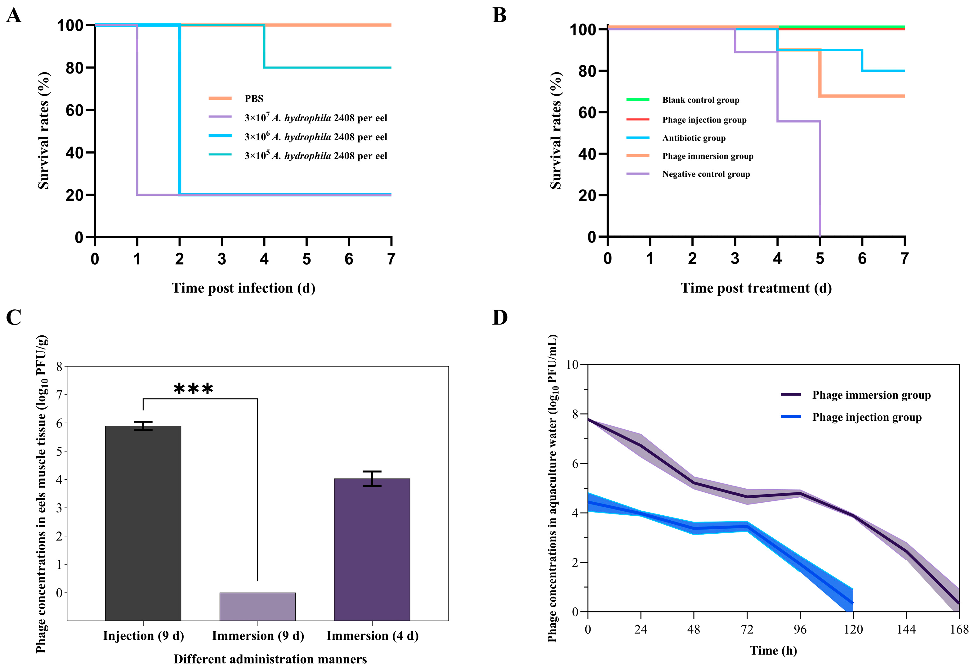 In vivo therapeutic efficacy of the phage Z90 against A. hydrophila 2408 infection in diseased eel model: (A) The establishment of A. hydrophila-infecting diseased eel model. Survival rate of eels after infection with A. hydrophila 2408 was shown. The PBS group received the injection of PBS, while other groups were injected with A. hydrophila 2408 at different concentrations. (B) Survival rates of diseased American eels after phage (immersion and intraperitoneal injection) and antibiotic treatments. In blank control group, healthy eels were not given any treatment. The eels in other four groups were first treated by intraperitoneal injection of 0.1 mL of A. hydrophila 2408 at a concentration of 6 × 106 CFU/mL. Two hours after bacterial infection, eels in the negative control group, antibiotic group, and phage injection group were injected with 0.1 mL of PBS, 0.1 mL of ampicillin (2.5 mg/mL), and 0.1 mL phage Z90 (6 × 108 PFU/mL), respectively. For the phage immersion group, phage concentrate was added to the aquaculture water to a final concentration of 108 PFU/mL. The survival curves were plotted using the KaplanMeier method, and the log-rank test was used to analyze the difference in survival rates. (C) The phage Z90 concentrations in the muscle tissue of American eels in the phage injection and immersion groups. Statistical analysis was performed using the Mann–Whitney U test (***, p < 0.001). (D) The phage Z90 concentrations in the aquaculture water of the phage injection and immersion groups.