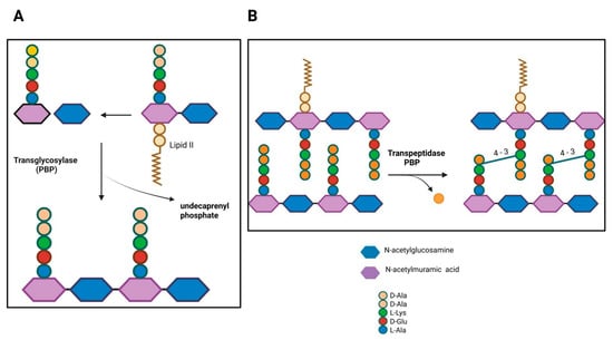 PBPs comprise two classes based on their molecular weight and enzymatic activity (glycosyltransferase and/or transpeptidase). Low molecular weight PBPs (LMM class C) are monofunctional enzymes, such as carboxypeptidases involved in peptidoglycan remodeling, while high molecular weight PBPs (HMM class A and B) are responsible for peptidoglycan polymerization and its insertion into the pre-existing cell wall [8]. The N-terminal domain of HMM PBPs class A is responsible for glycosyltransferase activity, catalyzing the elongation of non-crosslinked glycan chains. After lipid II (disaccharide-pentapeptide attached to the pyrophosphate-tethered undecaprenyl tail) is inverted to the periplasmic side, glycosyltransferases polymerize the sugar chains (Figure 1A), while the penicillin-binding C-terminal domain has transpeptidase activity, catalyzing the cross-linking of peptides between two adjacent glycan chains. PBP recognizes the terminal portion of D-alanine, catalyzing the attack of the carbonyl group of the penultimate D-alanine by the lateral amino group at position (3) of an adjacent chain (4–3 cross-link; Figure 1B). In class B, the N-terminal domain plays a role in cell morphogenesis through interaction with other proteins involved in the cell cycle [9].