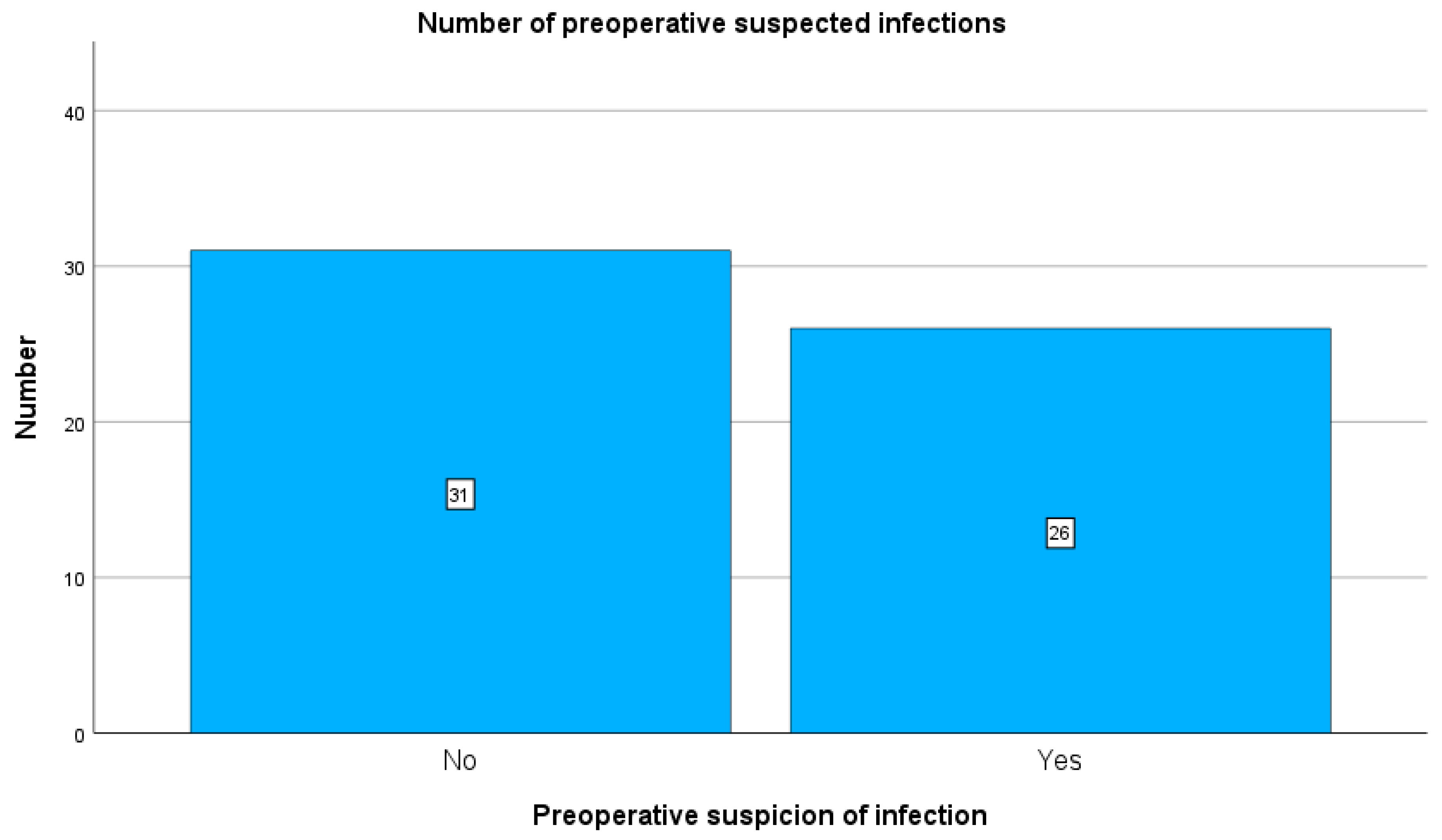 Preoperatively, 26 patients were clinically suspected of having an implant-related infection, whereas 31 patients had no preoperative clinical suspicion of infection (see