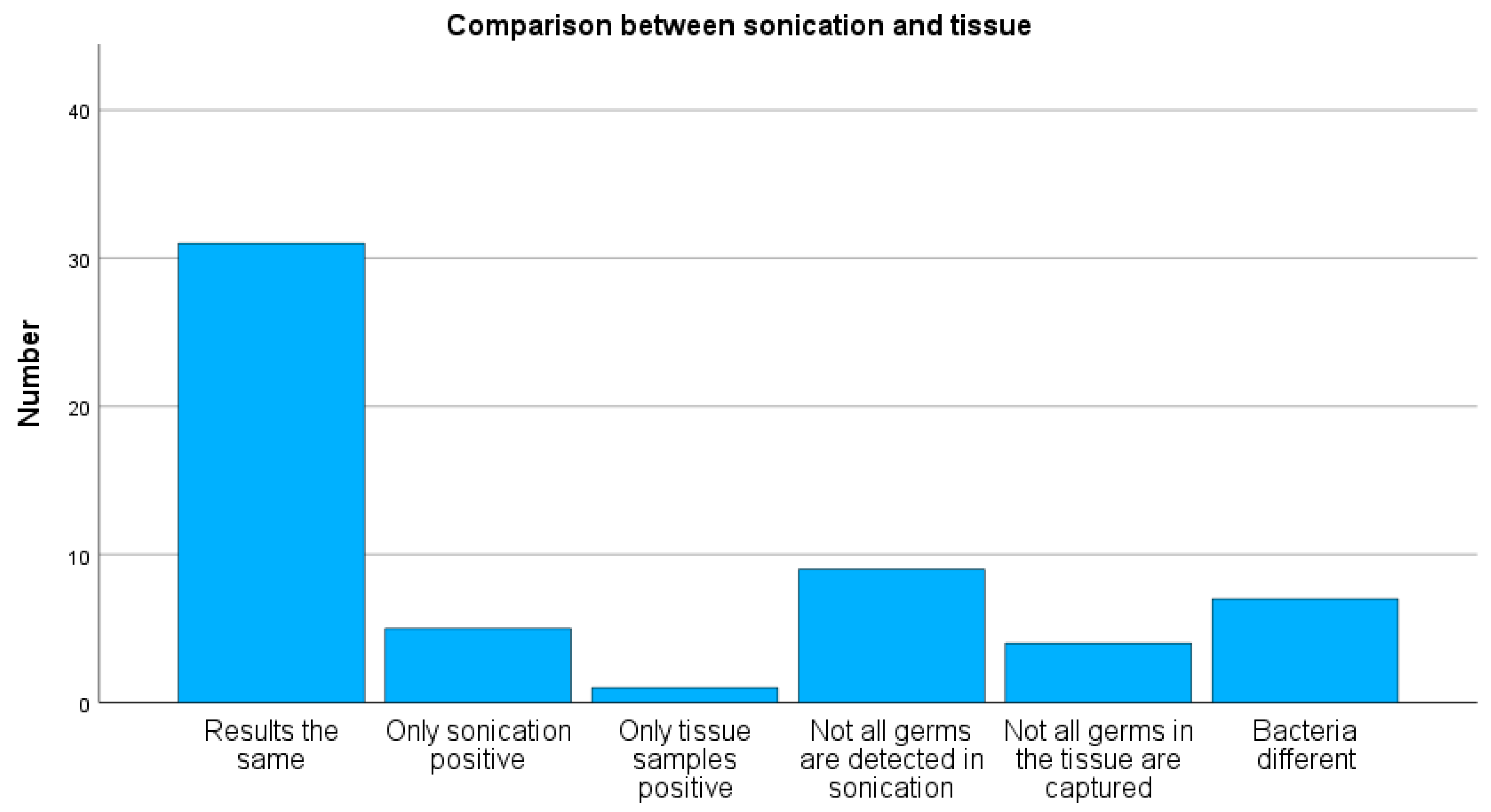 Thus, in just over 50% of cases, sonication and tissue samples showed concordant results.