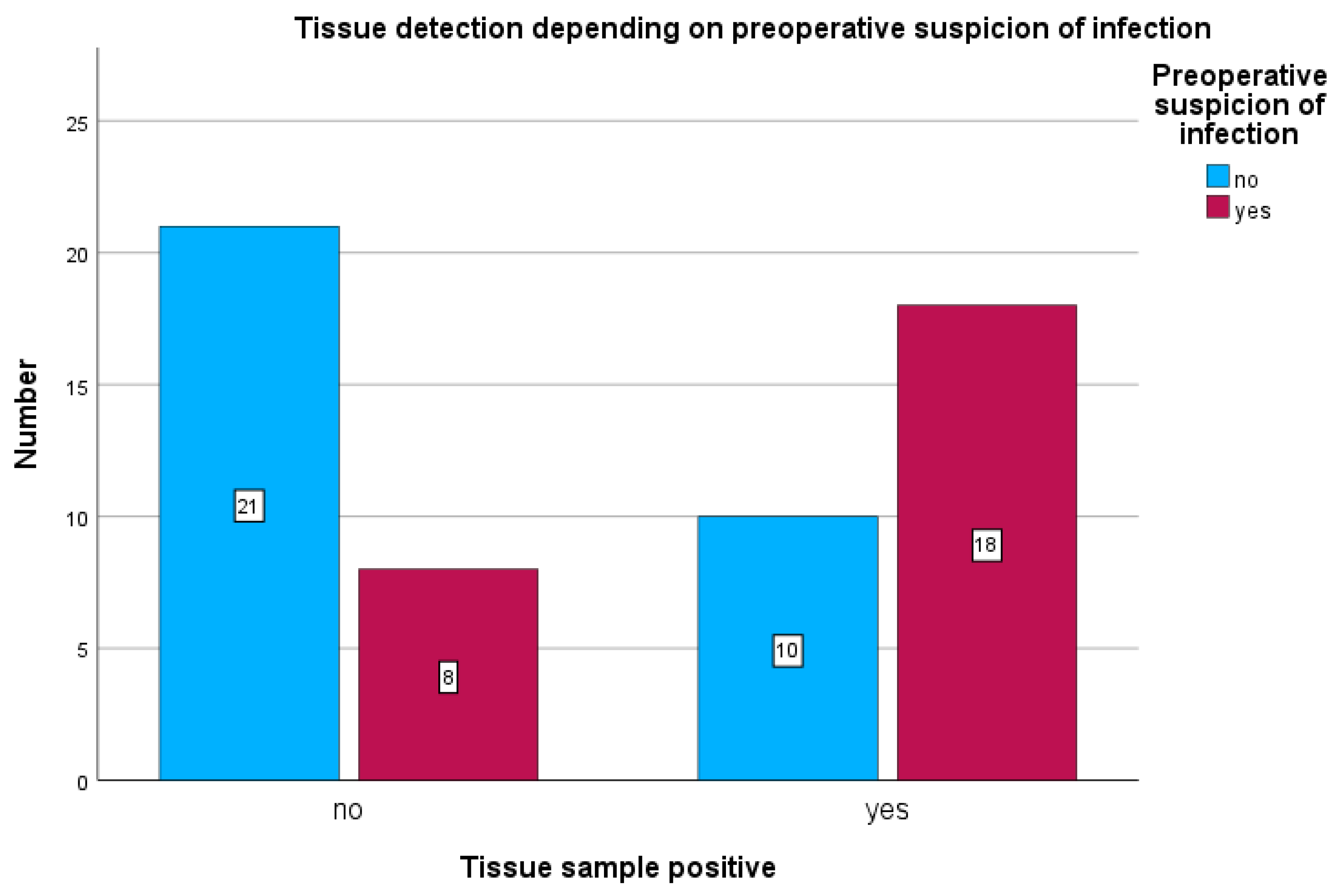 In summary, sonication is more sensitive in the presence of an infection membrane and therefore detects infections more reliably. However, its specificity is lower, resulting in more frequent false-positive results. Tissue samples, in contrast, have slightly lower sensitivity but considerably higher specificity, making them more reliable for confirming the absence of infection.