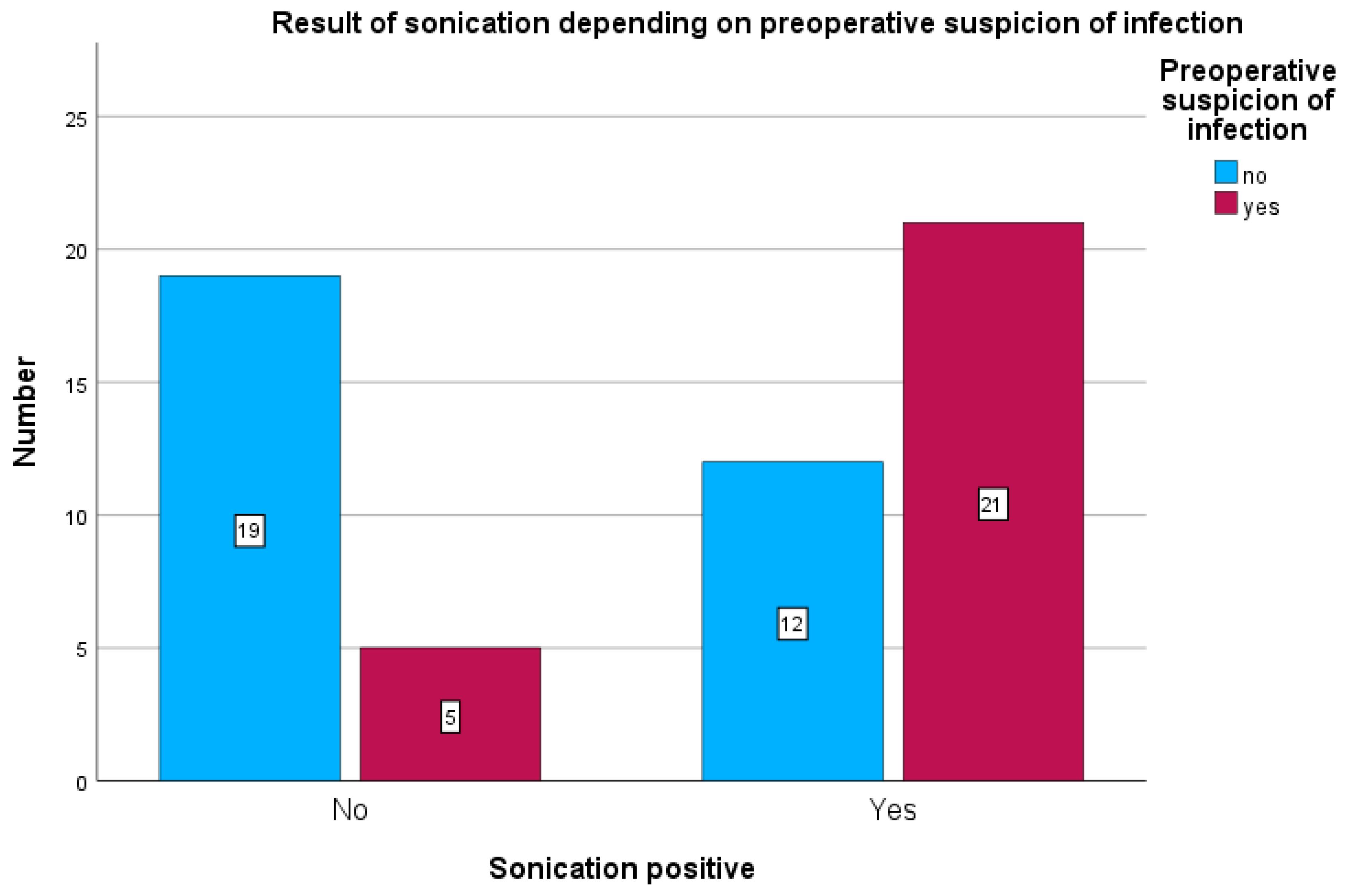 The aerobic and anaerobic microbiological results of tissue samples and sonication after implant removal were recorded and analyzed. Tissue culture results were subsequently compared with sonication results. Preoperative and postoperative infection parameters (leukocytes, CRP) were collected. Furthermore, pathological analysis was performed to evaluate the presence of an infection membrane.