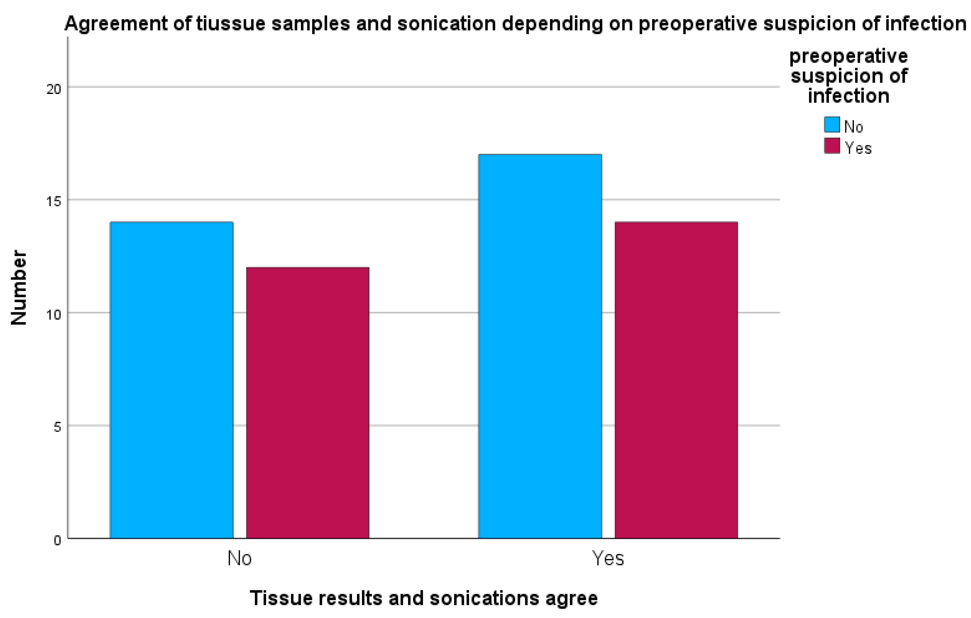 Of the 26 cases with preoperative infection suspicion, 14 cases (approximately 54%) showed identical results between sonication and tissue cultures. In only one case (4%) was sonication exclusively positive, while there were no cases with tissue cultures exclusively positive. In five cases (19%), sonication did not detect all bacteria, whereas in four cases (15%), tissue cultures were incomplete. In two further cases (8%), bacteria were detected by both methods but were different species.