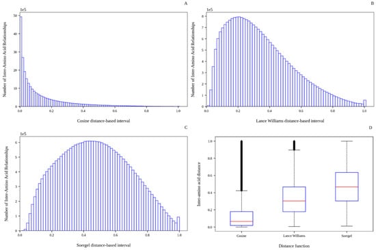 On the other hand, the Lance–Williams distance-based distribution (Figure 1B) is moderately positive-skewed (skewness between 0.5 and 1), with an average distance value of 0.34 (±0.20), and with a kurtosis close to 0 that indicates that the distribution tends to be similar to the normal distribution. As for the Soergel distance-based distribution (see Figure 1C), it is fairly symmetrical (skewness ranging from −0.5 to 0.5), platykurtic (kurtosis less than 0), and with an average distance value of 0.47 (±0.22). A platykurtic distribution has thinner tails and presents a lower and broader peak than the normal distribution, resulting in very few or no outliers. Indeed, it can be observed in Figure 1D that the Soergel function did not generate atypical values, while the Lance–Williams function generated a few; the Cosine function generated the greatest number of outliers. All these results indicate that the Soergel and Lance–Williams distance functions yield more stretched distributions (also see Figure 1D), making them more suitable than the Cosine distance function to characterize amino acid pairs that may be spatially close (or contiguous), such as amino acids forming up an alpha helix arrangement (see Figure S5).