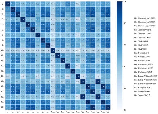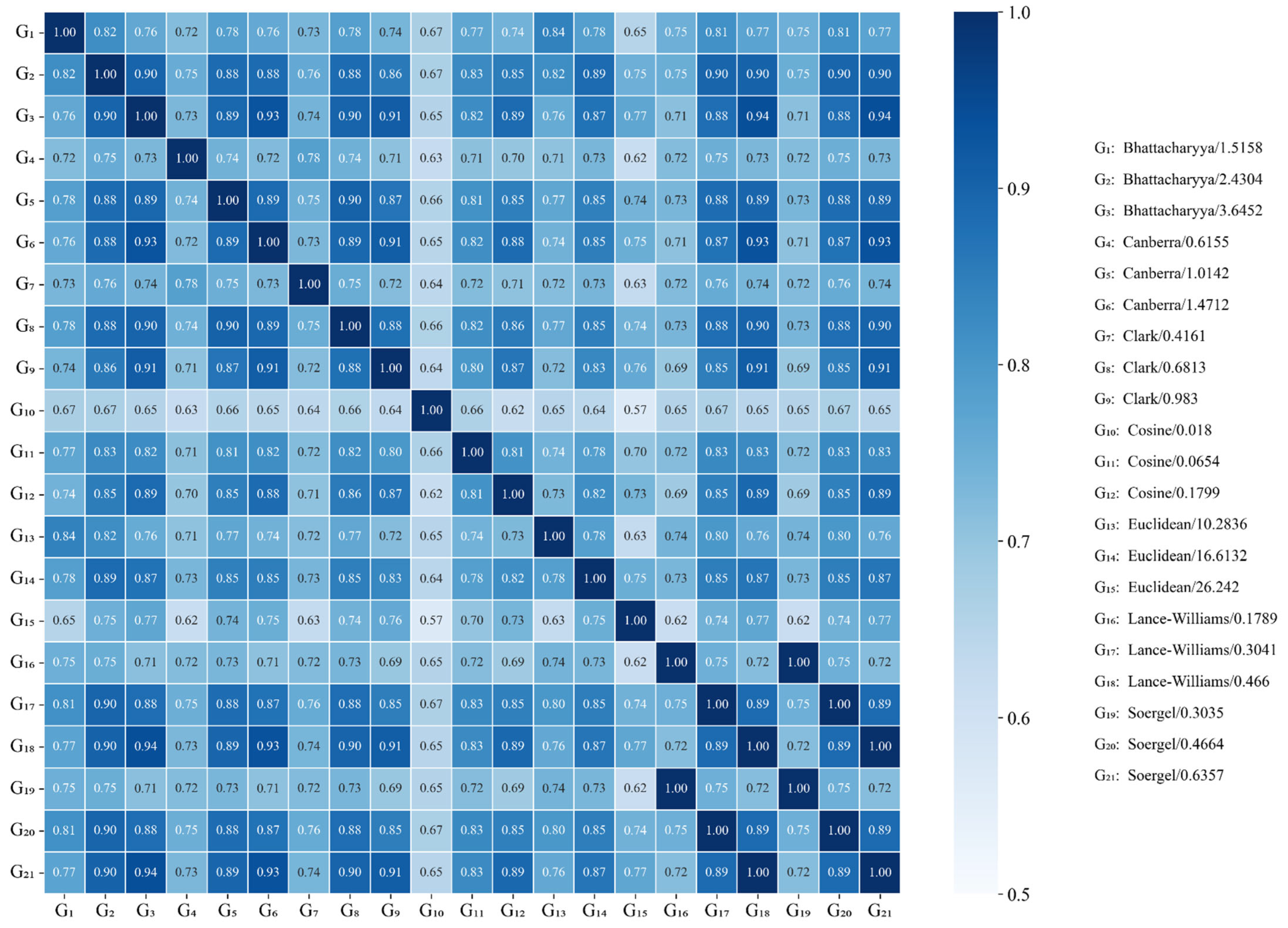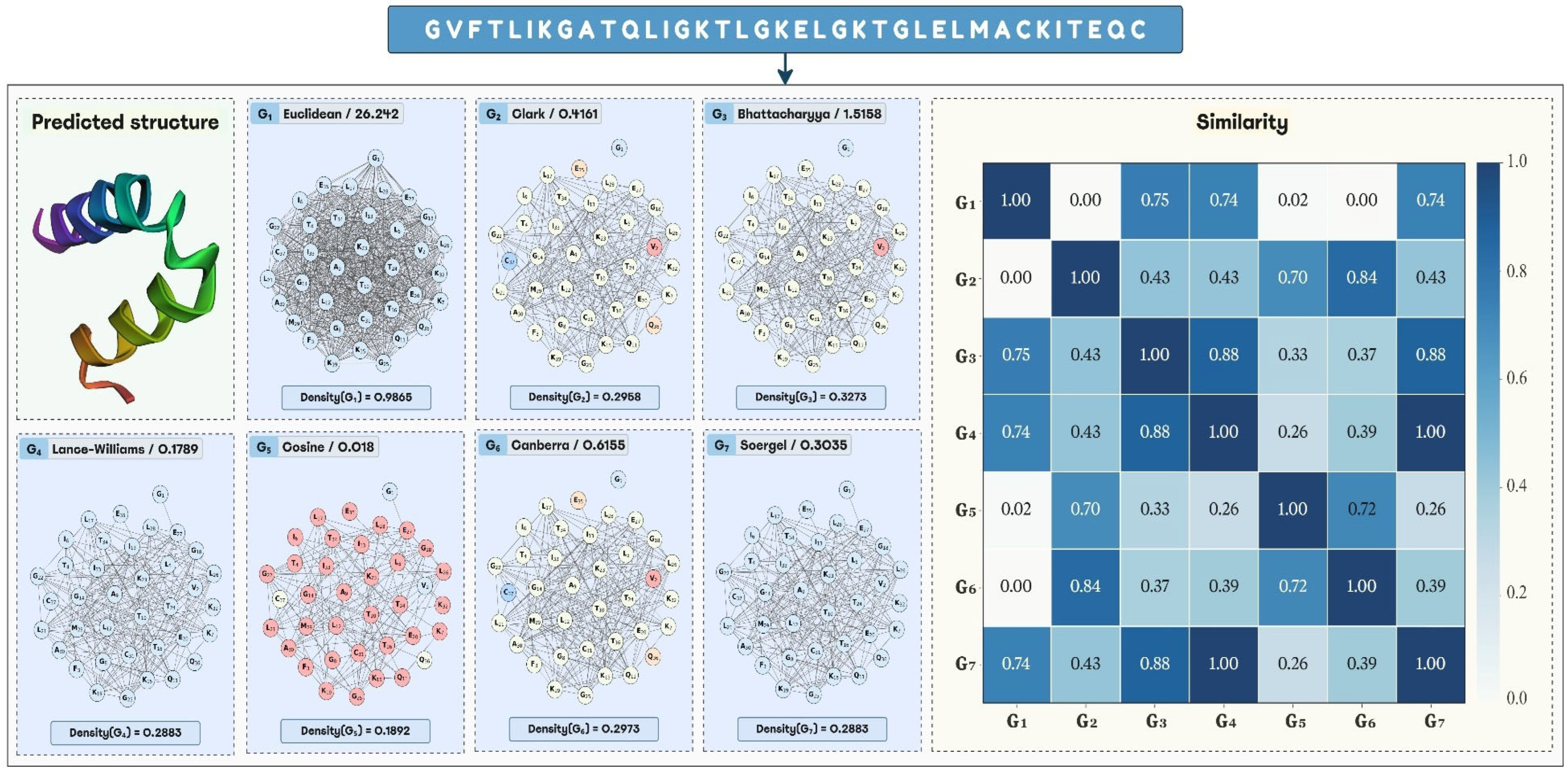 Figure 3. Graph representations built from the ESMFold-predicted structure of a given peptide (StarPep ID: 00743) by applying seven different distance thresholds, namely Euclidean/26.242 (G1), Clark/0.4161 (G2), Bhattacharyya/1.5158 (G3), Lance–Williams/0.1789 (G4), Cosine/0.018 (G5), Canberra/0.6155 (G6), and Soergel/0.3035 (G7). A heat map representing the similarity between each graph pair is also shown.