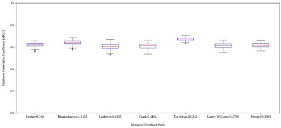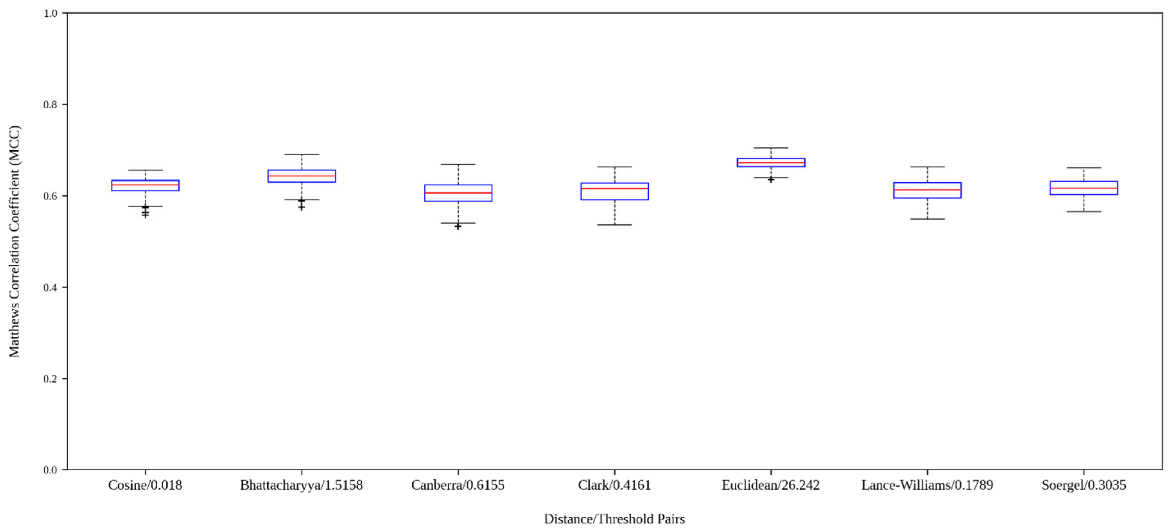 Figure 4 depicts boxplots corresponding to the MCC v a l values yielded by the built models (see Table S3 for raw data). It can be seen that the values are not scattered from each other in each distribution, which indicates that models with good performance can be consistently trained with the graphs derived from the distance thresholds considered. In this sense, notice that the second quartile of each distribution is superior to 0.6, indicating that at least 50% of all models performed above that value. The best distribution of MCC v a l values is that of the models based on the graphs built with the Euclidean distance threshold of 26.242, while the second- and third-best distributions correspond to the models created with the graphs built with the Bhattacharyya and Cosine distance thresholds of 1.5158 and 0.018, respectively.