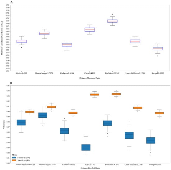 Figure 5. Boxplots corresponding to the MCC, SN, and SP values yielded on the AVPDiscover test set by the best model trained with the graphs derived from the distance/thresholds pairs analyzed in this work. Figure 5A shows the MCC values, whereas the SN and SP values are shown in Figure 5B.