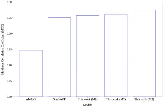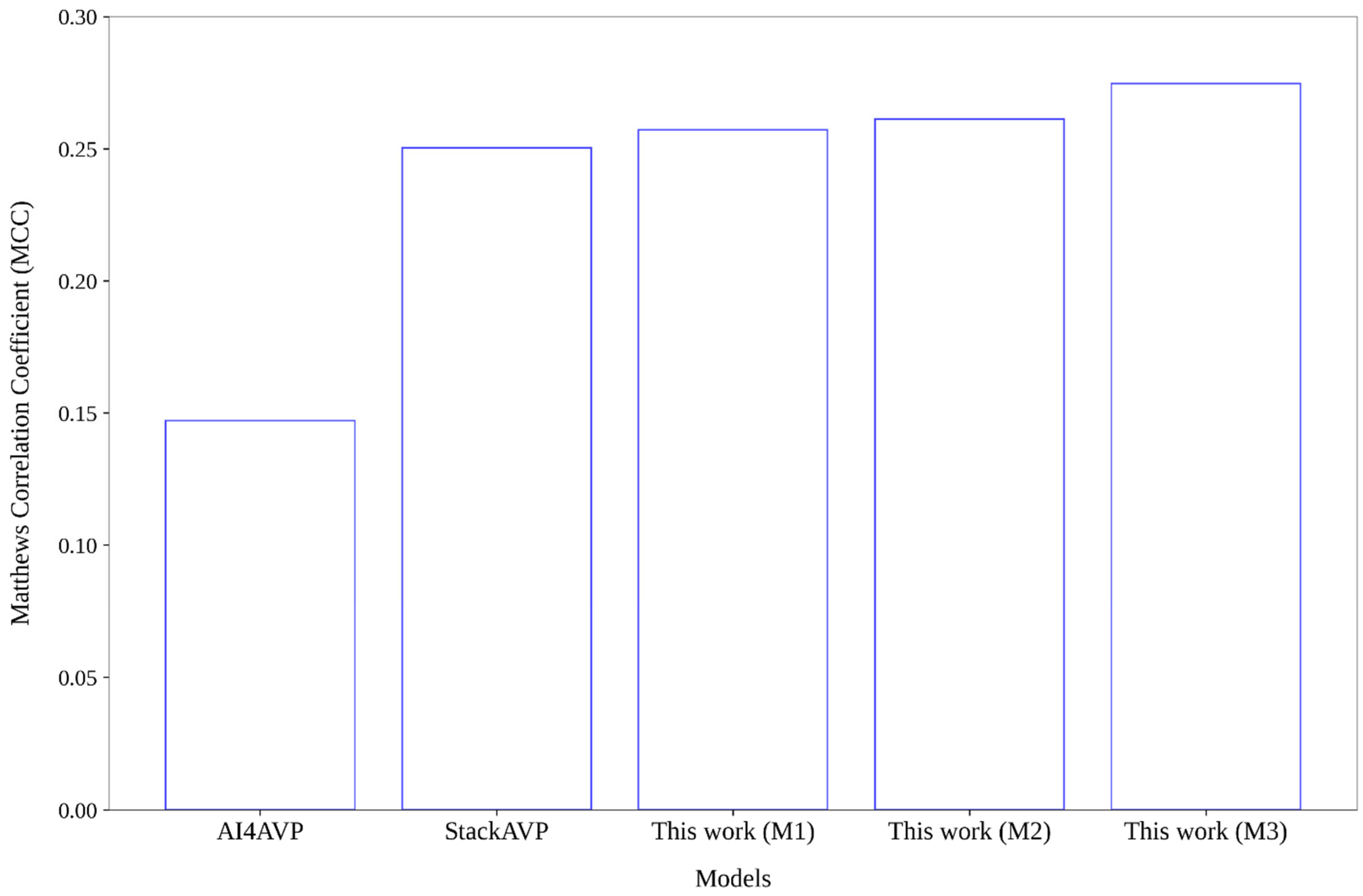 Figure 6. Matthews Correlation Coefficient (MCC) values obtained by the AI4AVP and Stack-AVP models reported in the literature, as well as by the best three graph-based combined models that were developed in this work. The M1, M2, and M3 combined models correspond to the fusing of the output of the individual models fed with the graphs derived from the Euclidean/26.242 and Clark/0.4161 distance thresholds, from the Euclidean/26.242 and Cosine/0.018 distance thresholds, and from the Euclidean/26.242, Cosine/0.018, and Bhattacharyya/1.5158 distance thresholds, respectively.