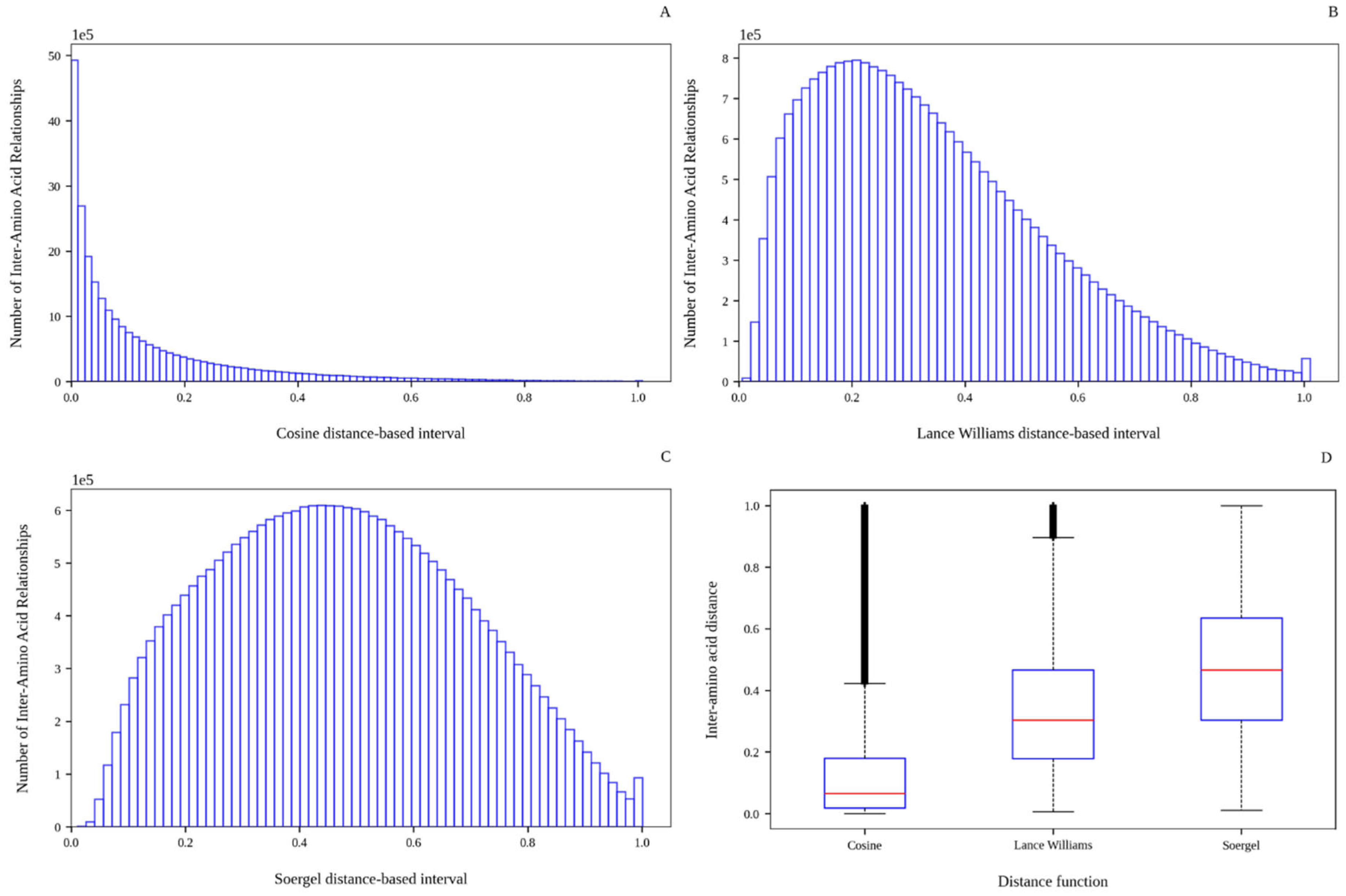 Figure 1. Histograms and boxplots of the inter-amino acid distance distributions obtained with the Cosine (A), Lance–Williams (B), and Soergel (C) distance functions, respectively.