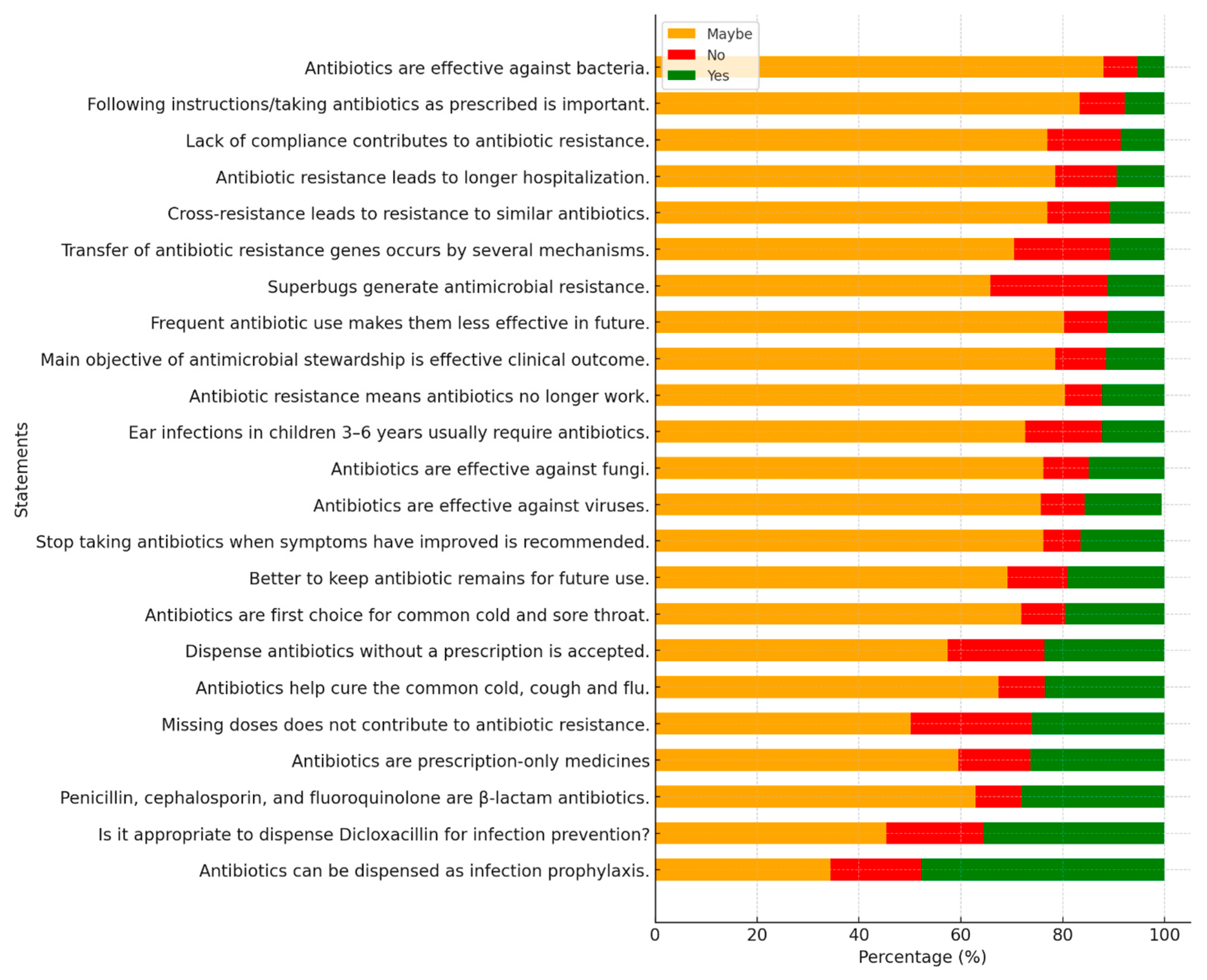 20]. The understanding of AMR mechanisms was also very poor, with less than 15 percent of participants understanding the resistance development pathways concerning dose completion. The lack of this is also indicated by results in India and Kenya [