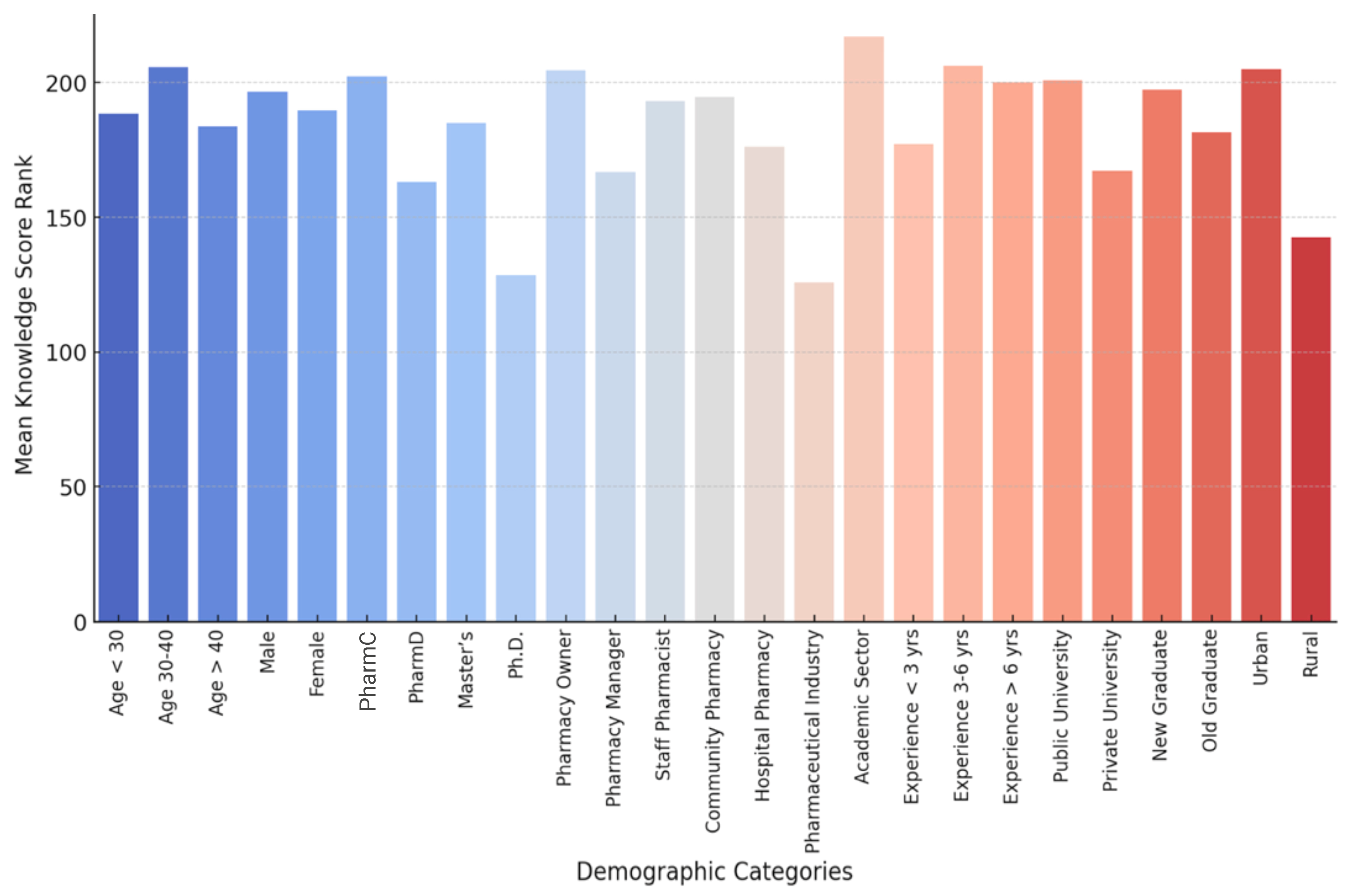 21] found that 43.1% of pharmacists nationally accessed continuing education programs, our informal follow-up queries suggest that <20% of rural southern pharmacists have regular access to such programs. Third, practice location emerged as the strongest predictor in our southern sample (explaining 8.5% of knowledge variance), suggesting that geographic isolation compounds educational barriers. Moreover, the gap between poverty levels (rural 25%, national scale 14%) and population size (rural 52%, national scale 15%), as well as variations in the healthcare infrastructure, were not addressed. Therefore, such structural inequalities may tend to create systemic disparities that obstruct ideal antimicrobial stewardship in rural areas.