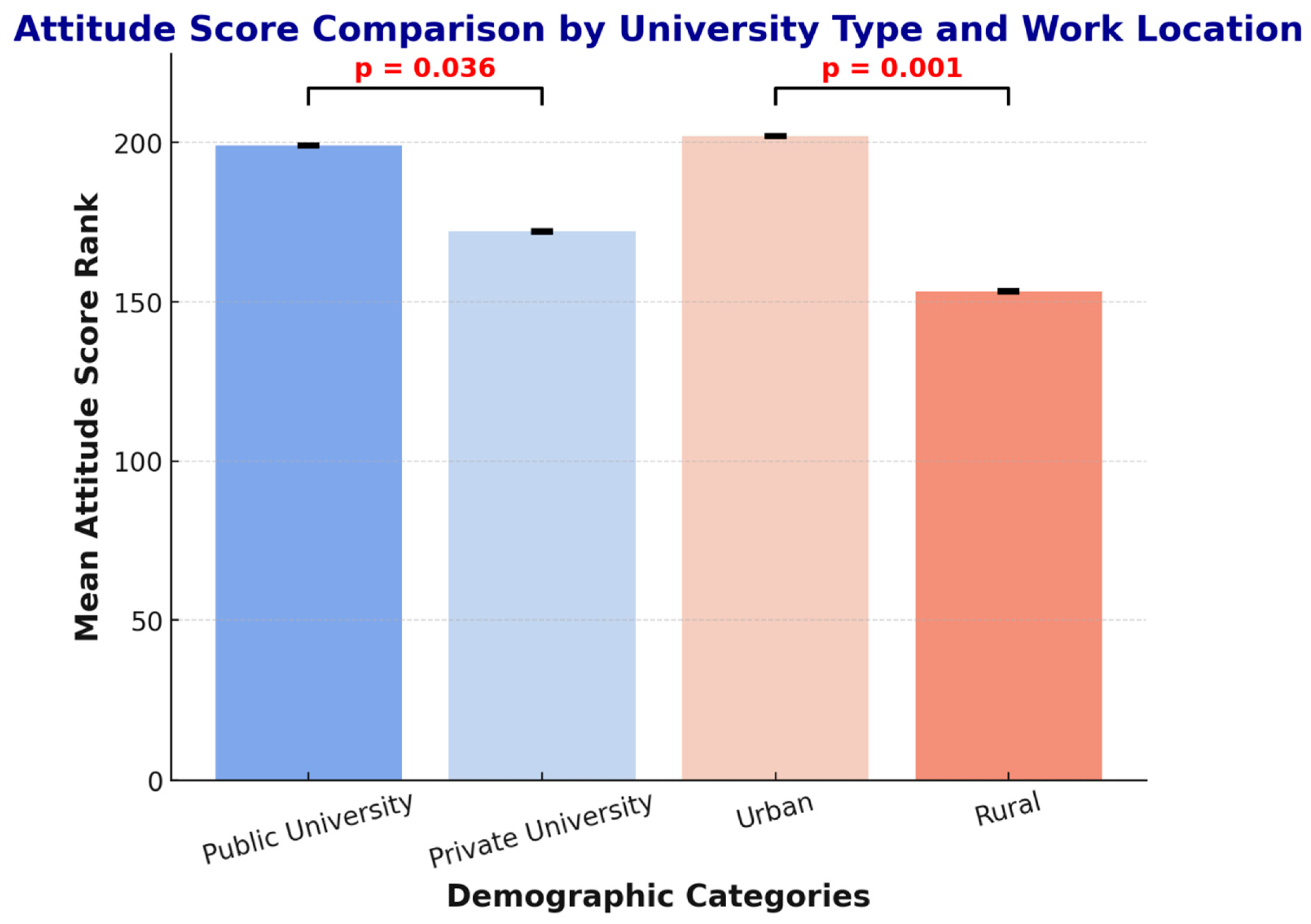 p = 0.036, r = 0.12), with public university graduates demonstrating more positive attitudes (median = 4.1) compared to private university graduates (median = 3.8). Practice location also showed a strong association (