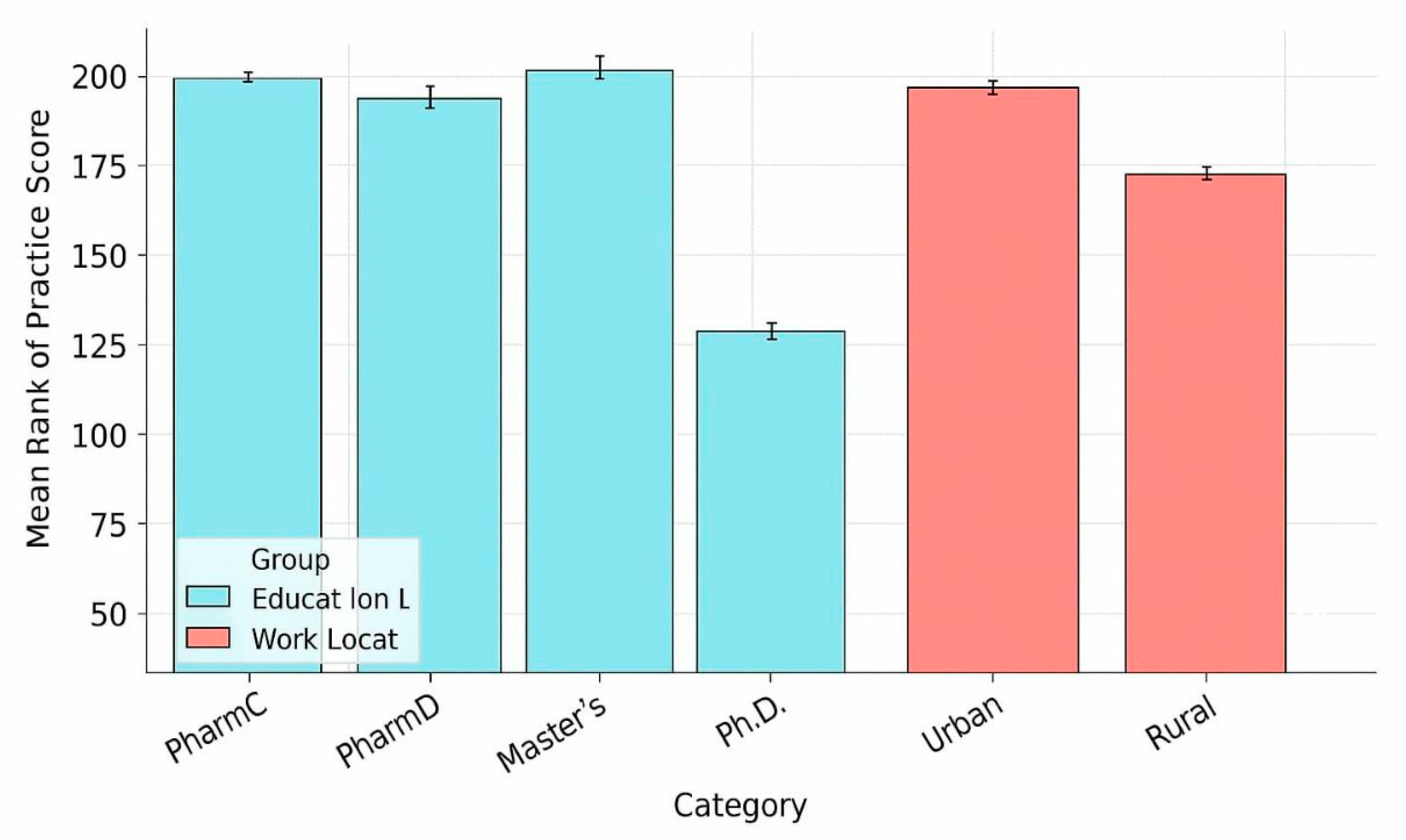 p = 0.048, r = 0.11), with urban pharmacists demonstrating superior practices (median = 4.1, IQR = 3.7–4.4) compared to their rural counterparts (median = 3.8, IQR = 3.4–4.1).