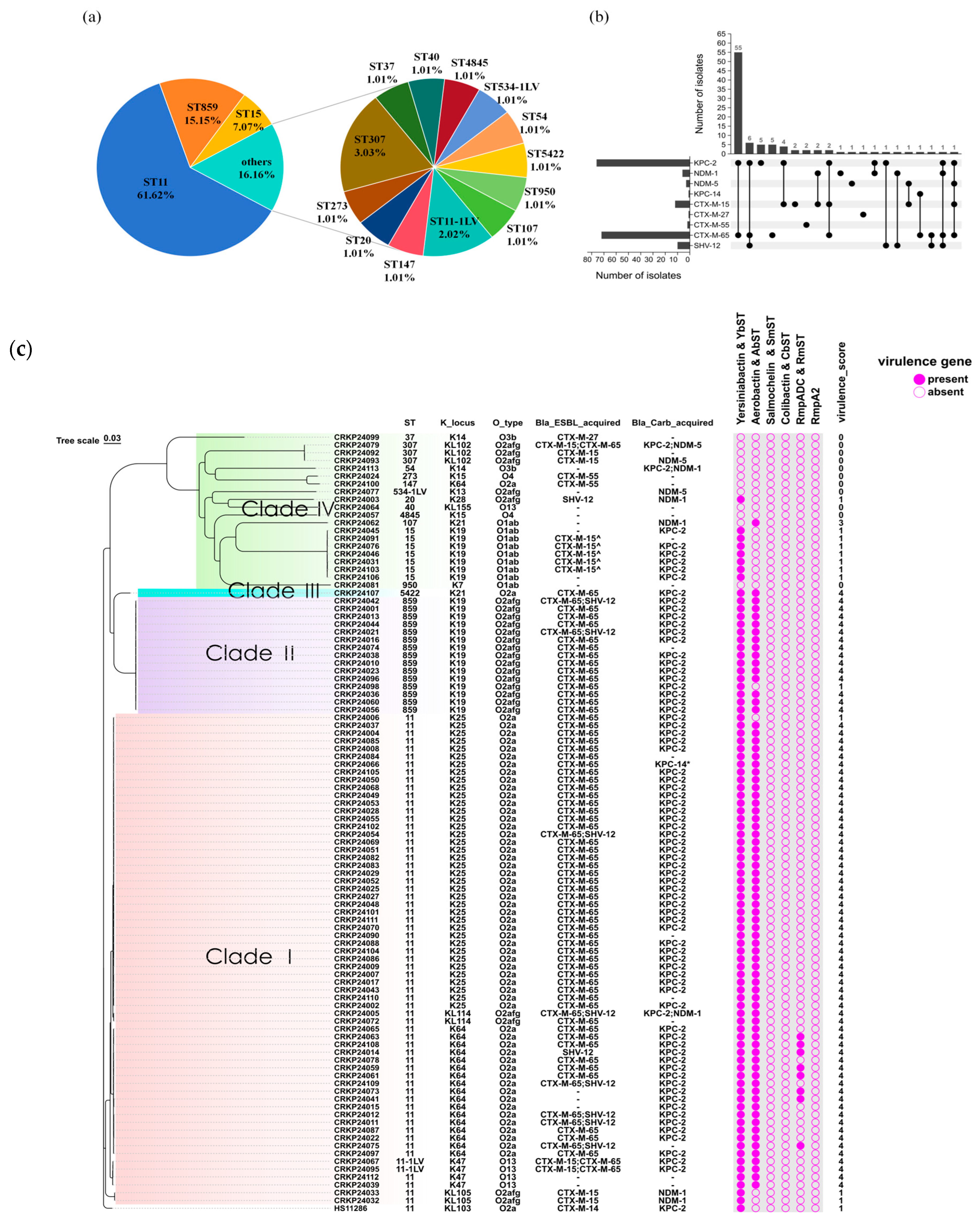 19. Kang, Y.; Xu, C.; Ma, W.; Li, Q.; Jia, W.; Wang, P. Genomic characterization of ST11-KL25 hypervirulent KPC-2-producing multidrug-resistant Klebsiella pneumoniae from China. iScience 2024, 27, 11471. [Google Scholar] [CrossRef]