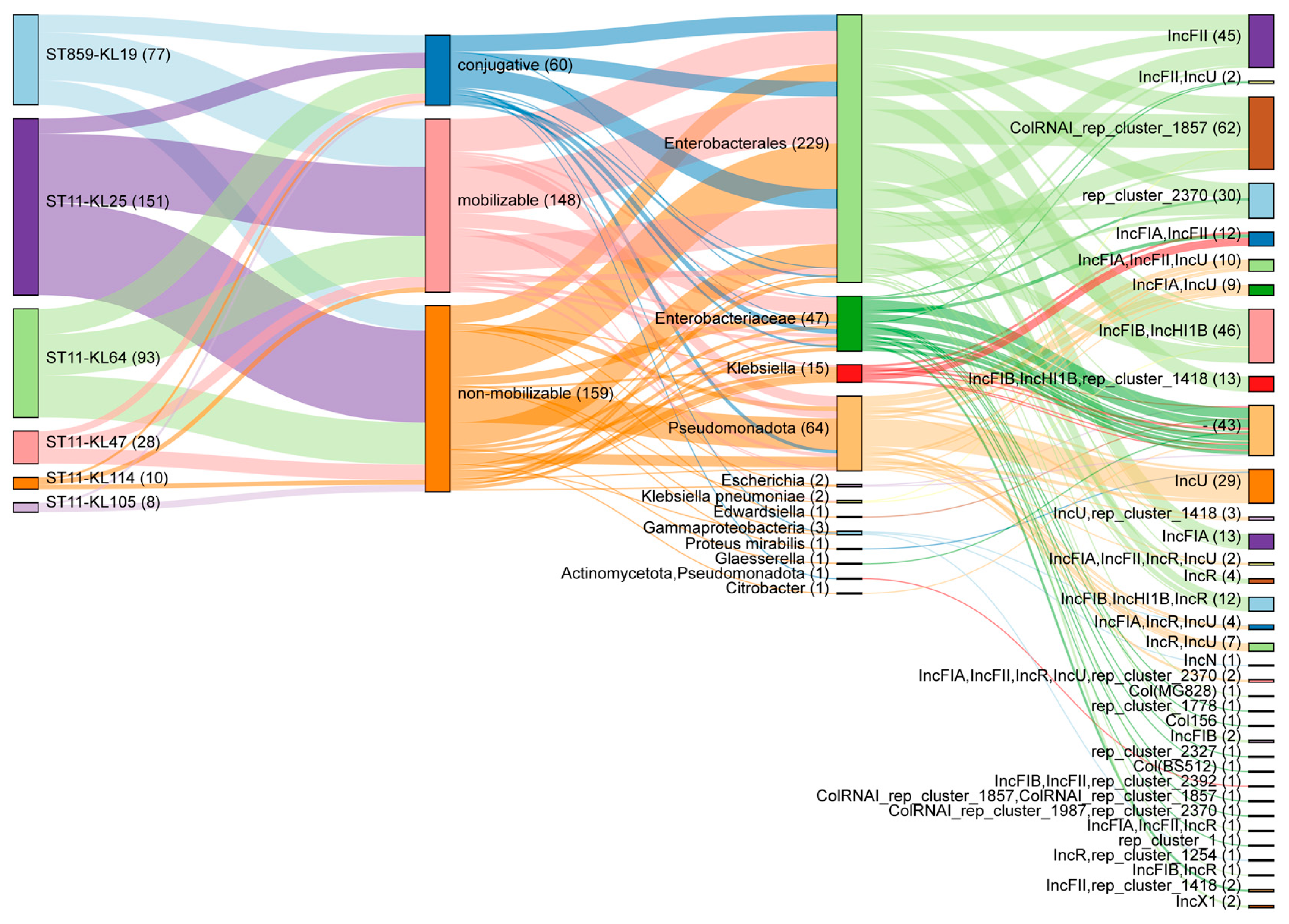 Figure 4. Genomic analysis of plasmids in ST859 and different capsular serotype ST11 CRKP isolates. Sankey diagram illustrating the association between plasmid type, predicted host range, and plasmid replicon type in ST859-KL19, ST11-KL25, ST11-KL64, ST11-KL47, ST11-KL105 and ST11-KL114 CRKP isolates. The thickness of each line is proportional to the number of plasmids.