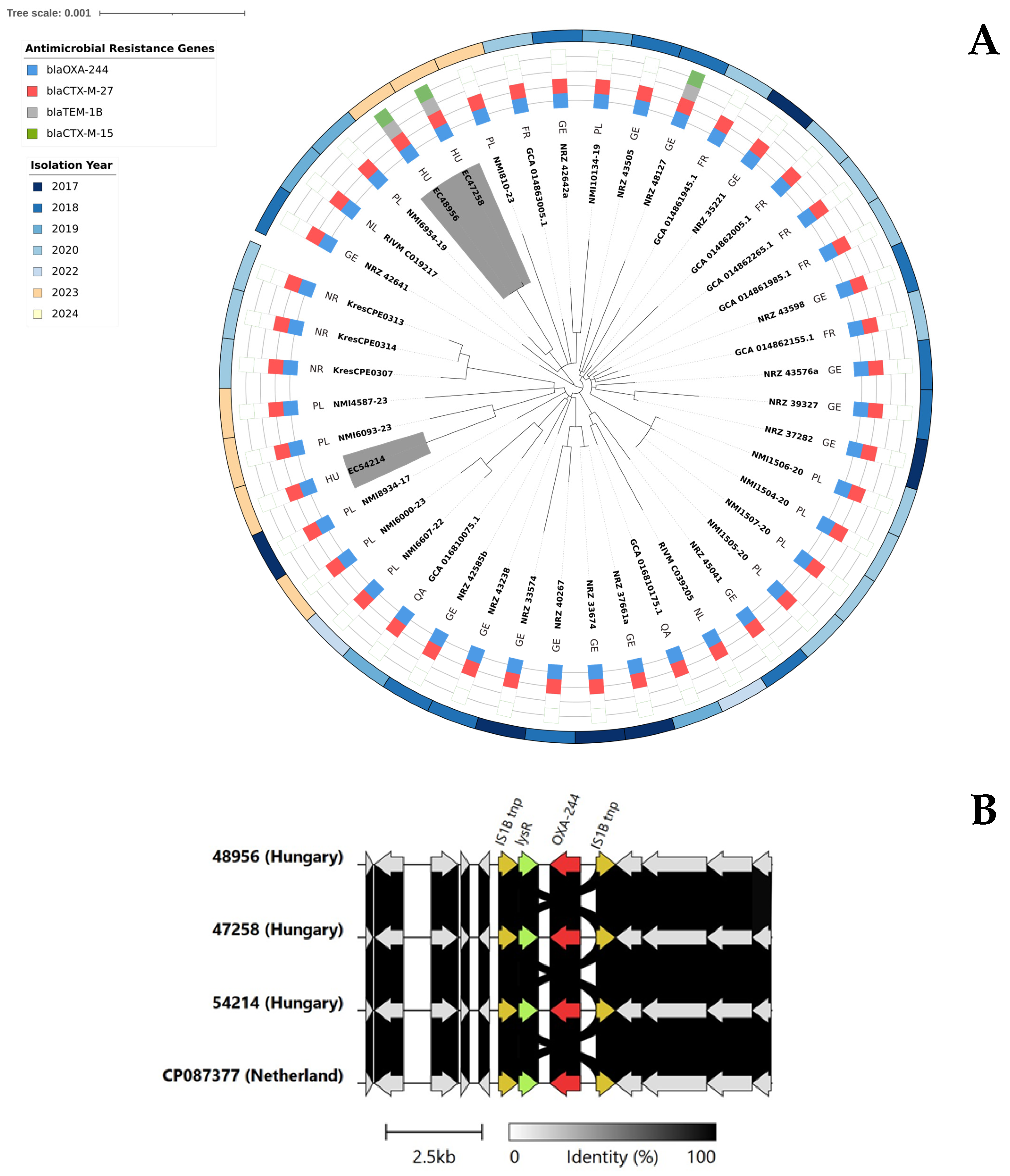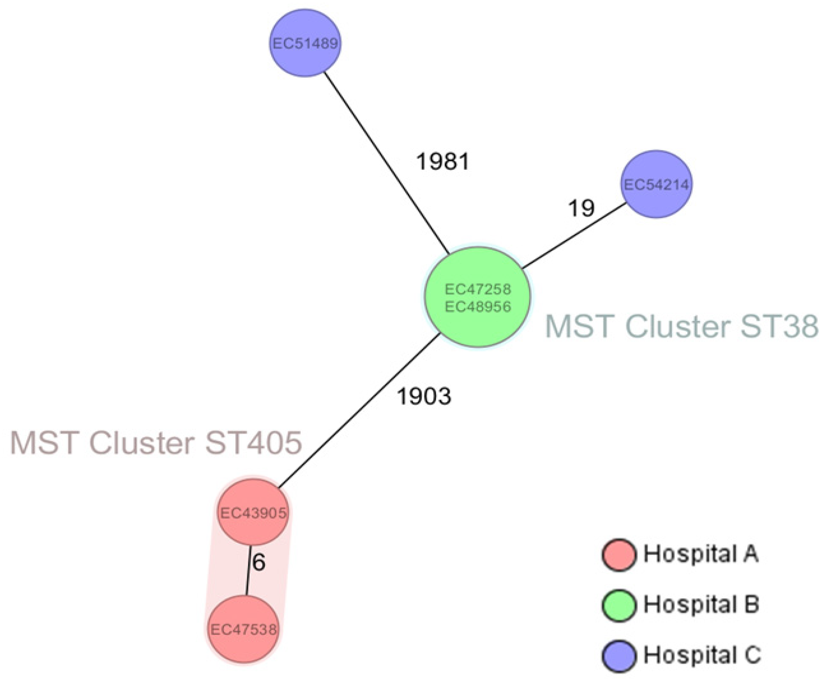 - Notermans, D.W.; Schoffelen, A.F.; Landman, F.; Wielders, C.C.H.; Witteveen, S.; Ganesh, V.A.; van Santen-Verheuvel, M.; de Greeff, S.C.; Kuijper, E.J.; Hendrickx, A.P.A.; et al. A genetic cluster of OXA-244 carbapenemase-producing Escherichia coli ST38 with putative uropathogenicity factors in the Netherlands. J. Antimicrob. Chemother. 2022, 77, 3205–3208. [Google Scholar] [CrossRef] [PubMed]