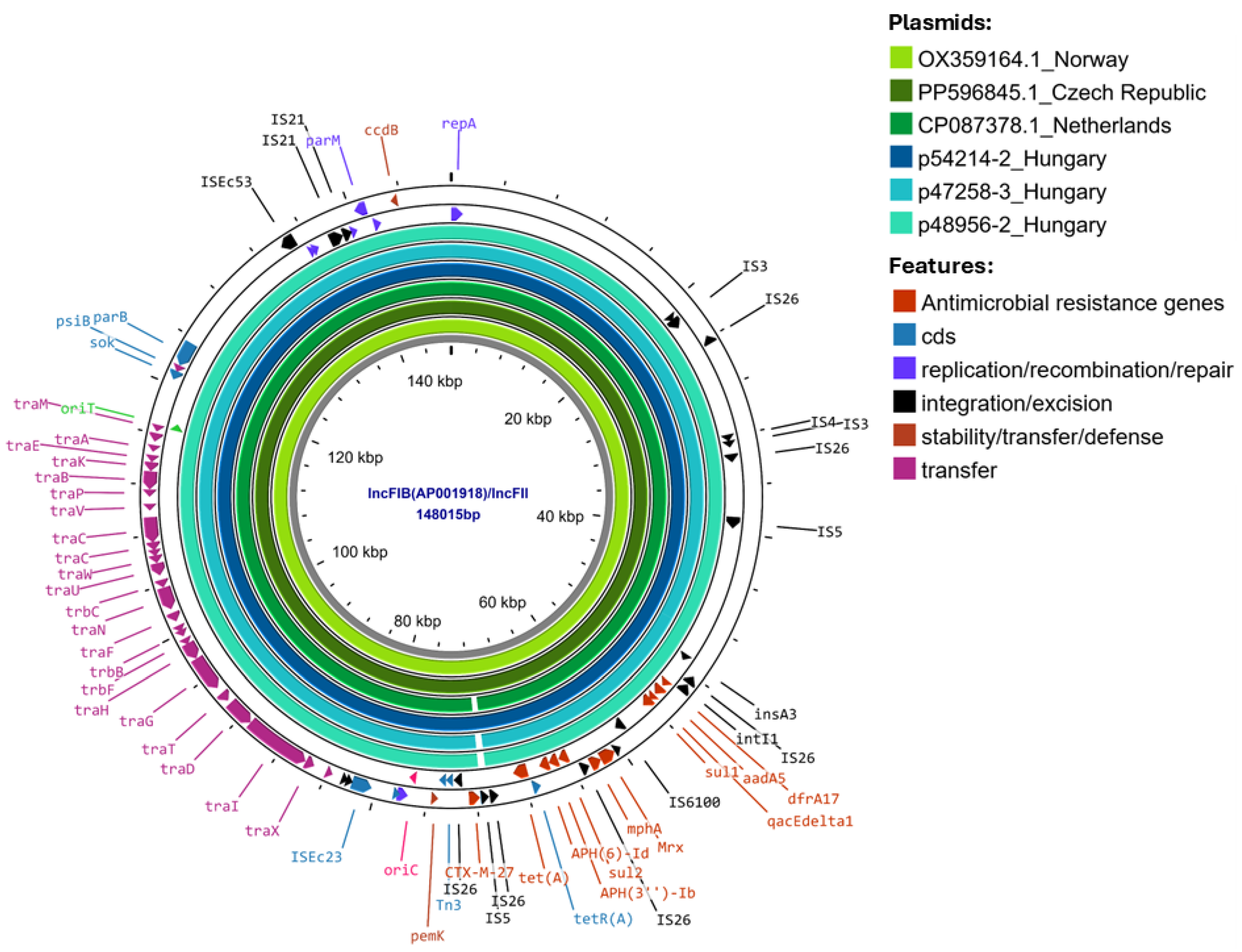 | p48956-2 | IncFIB(AP001918)-IncFII | 147,410 | blaCTX-M-27, tet(A), aph(6)-Id, aadA5, aph(3″)-Ib, mph(A), sul1, sul2, dfrA17 | ||
