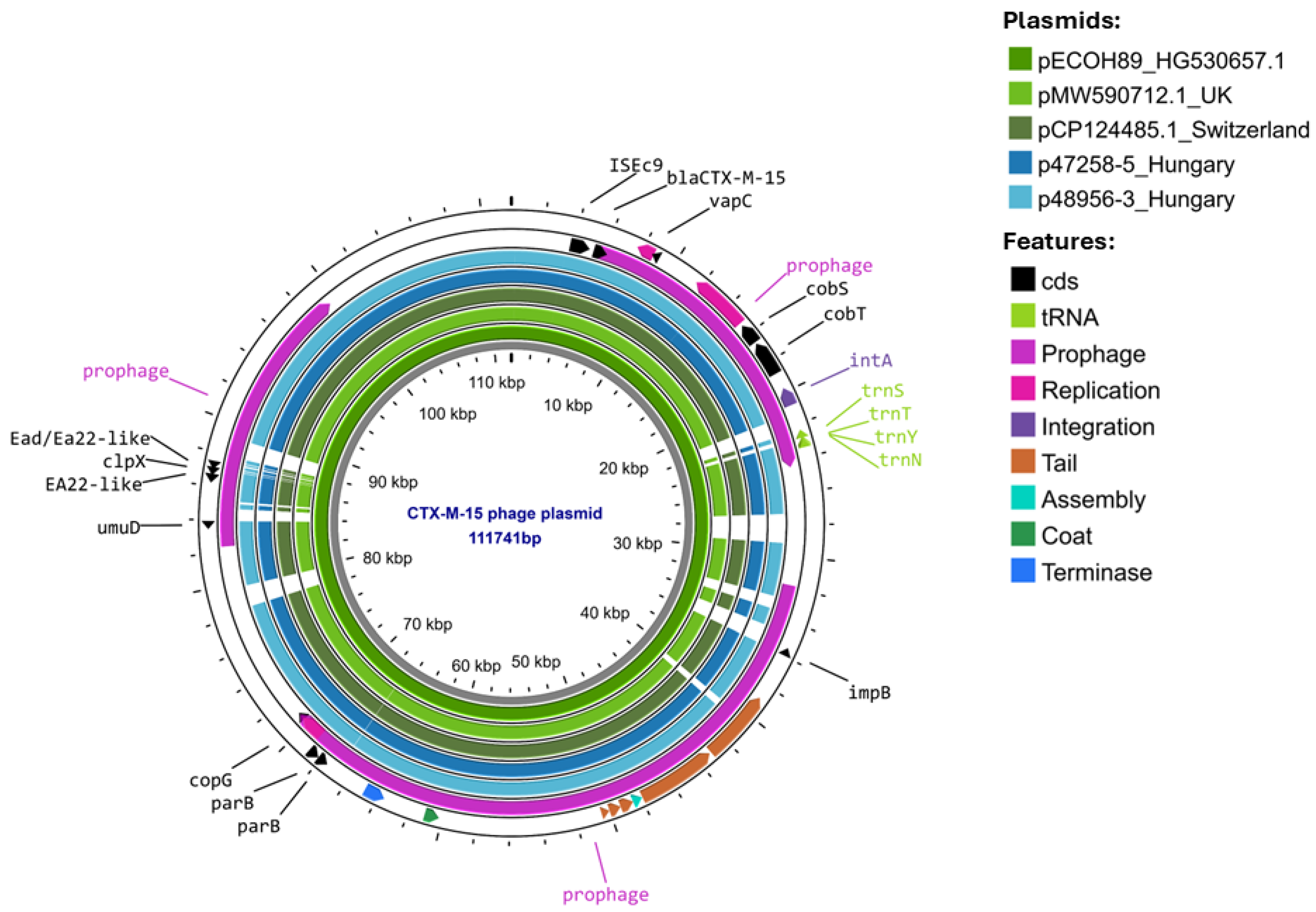 - Falgenhauer, L.; Yao, Y.; Fritzenwanker, M.; Schmiedel, J.; Imirzalioglu, C.; Chakraborty, T. Complete Genome Sequence of Phage-Like Plasmid pECOH89, Encoding CTX-M-15. Genome Announc. 2014, 2, e00356-14. [Google Scholar] [CrossRef] [PubMed]