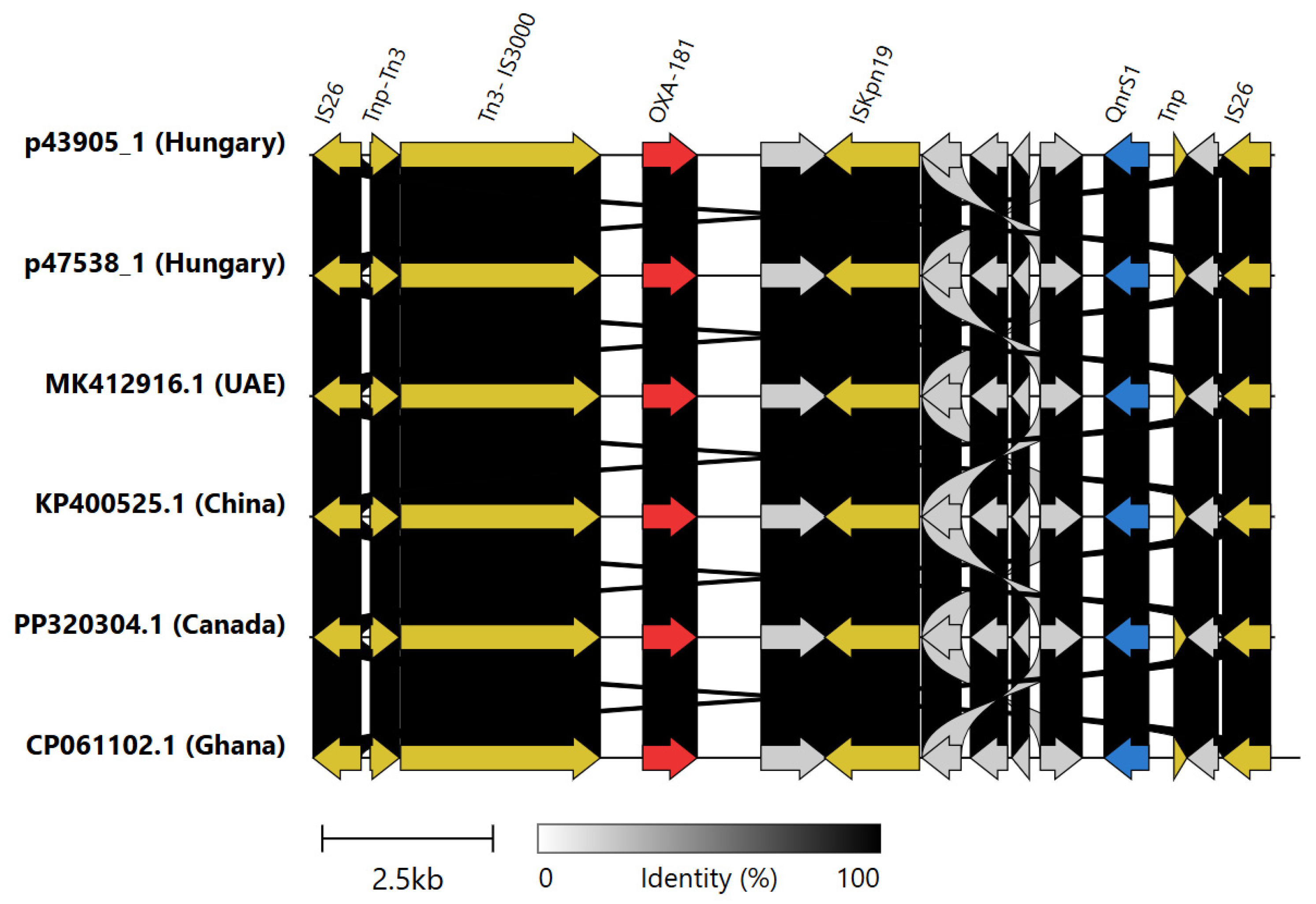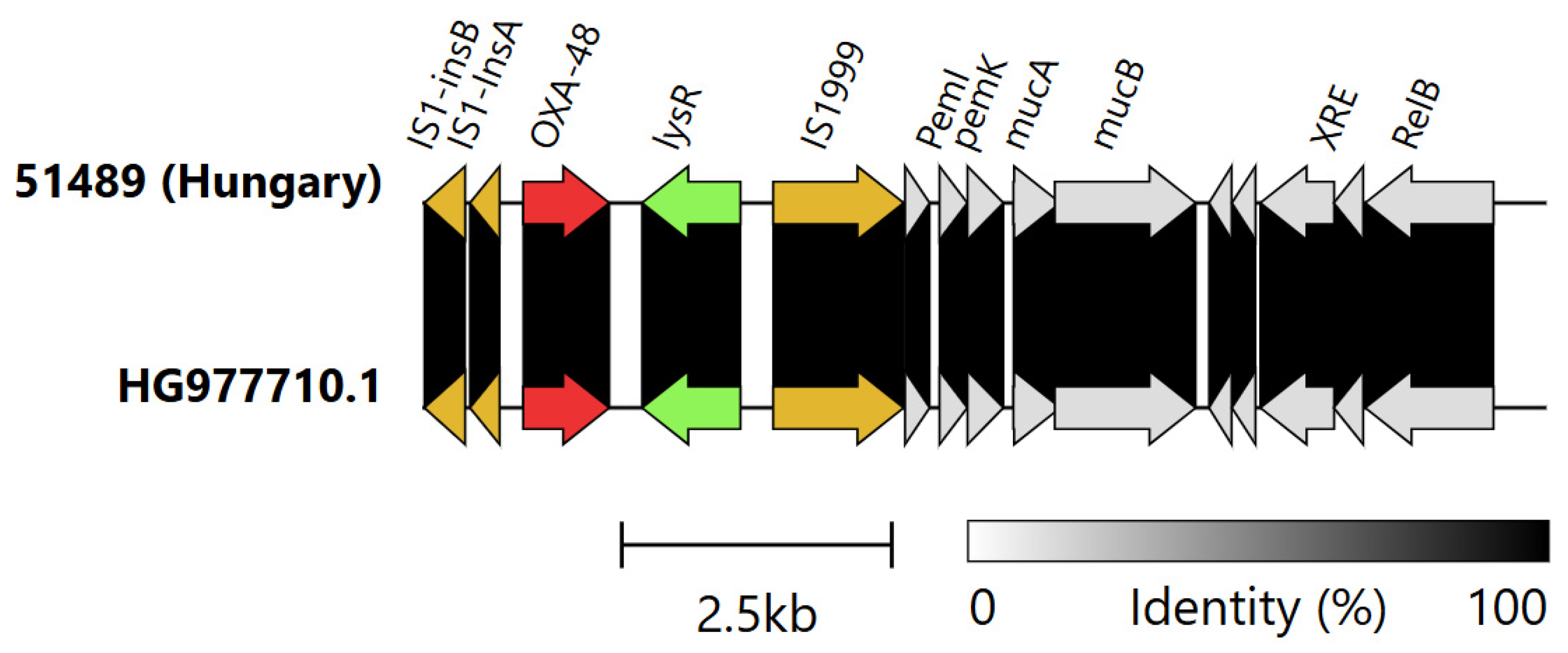 2.3. In Vitro Transferability of OXA-48-like Carbapenemases
