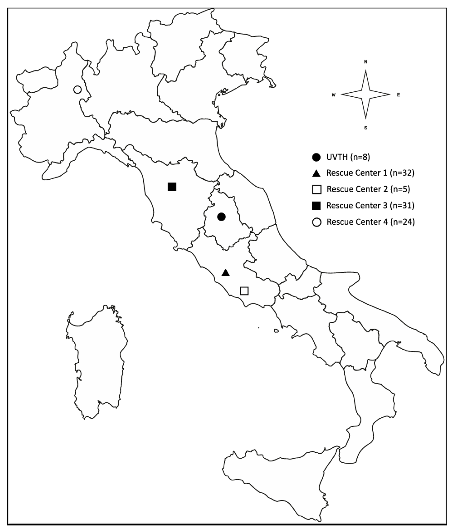 - Marenzoni, M.L.; Stefanetti, V.; Del Rossi, E.; Zicavo, A.; Scuota, S.; Origgi, F.C.; Deli, G.; Corti, C.; Trabalza Marinucci, M.; Olivieri, O. Detection of Testudinid Alphaherpesvirus, Chlamydia Spp., Mycoplasma Spp., and Salmonella Spp. in Free-ranging and Rescued Italian Testudo hermanni hermanni. Vet. Ital. 2022, 58, 25–34. [Google Scholar] [CrossRef]