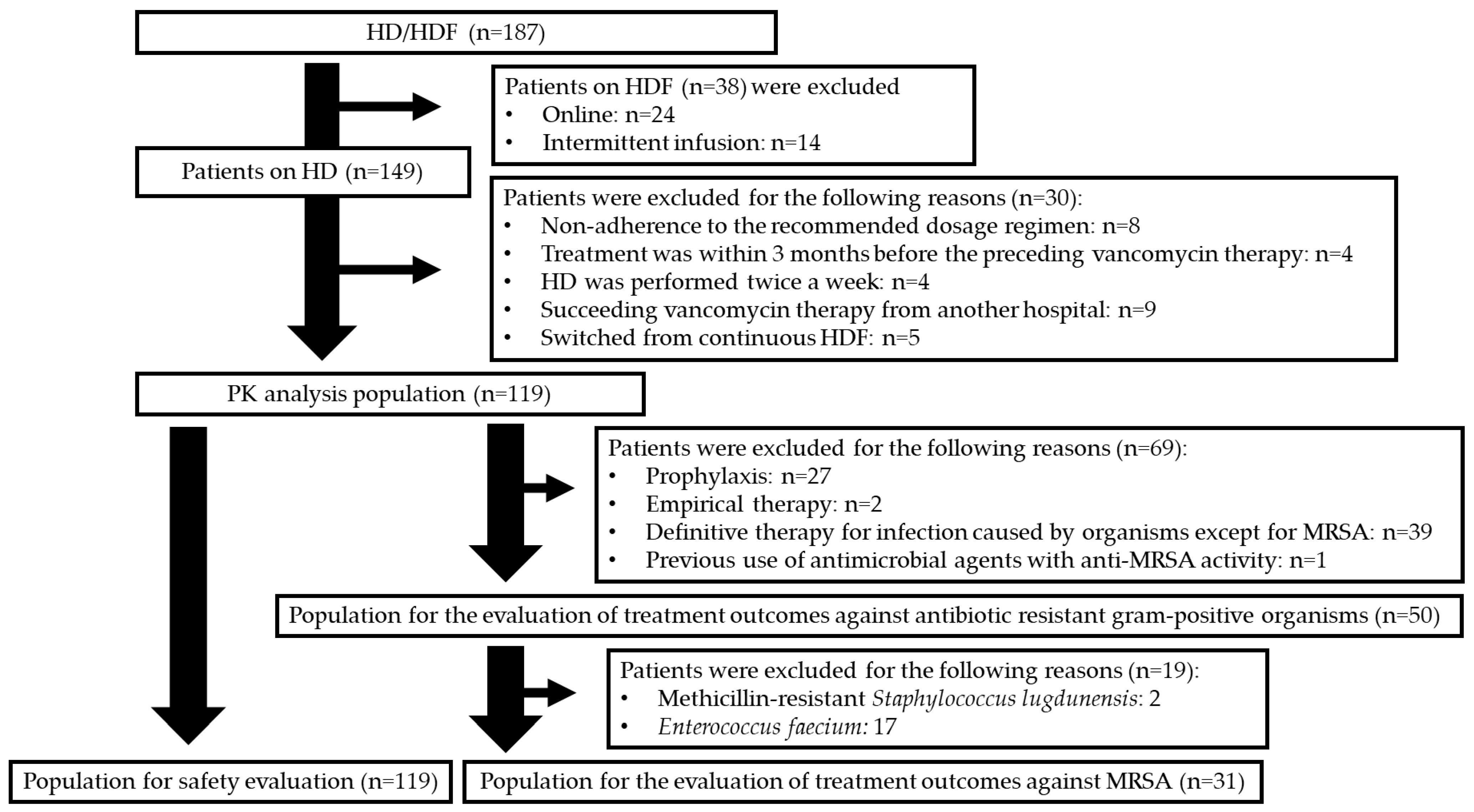 - Oda, K.; Jono, H.; Saito, H. Model-Informed Precision Dosing of Vancomycin in Adult Patients Undergoing Hemodialysis. Antimicrob. Agents Chemother. 2023, 67, e0008923. [Google Scholar] [CrossRef]