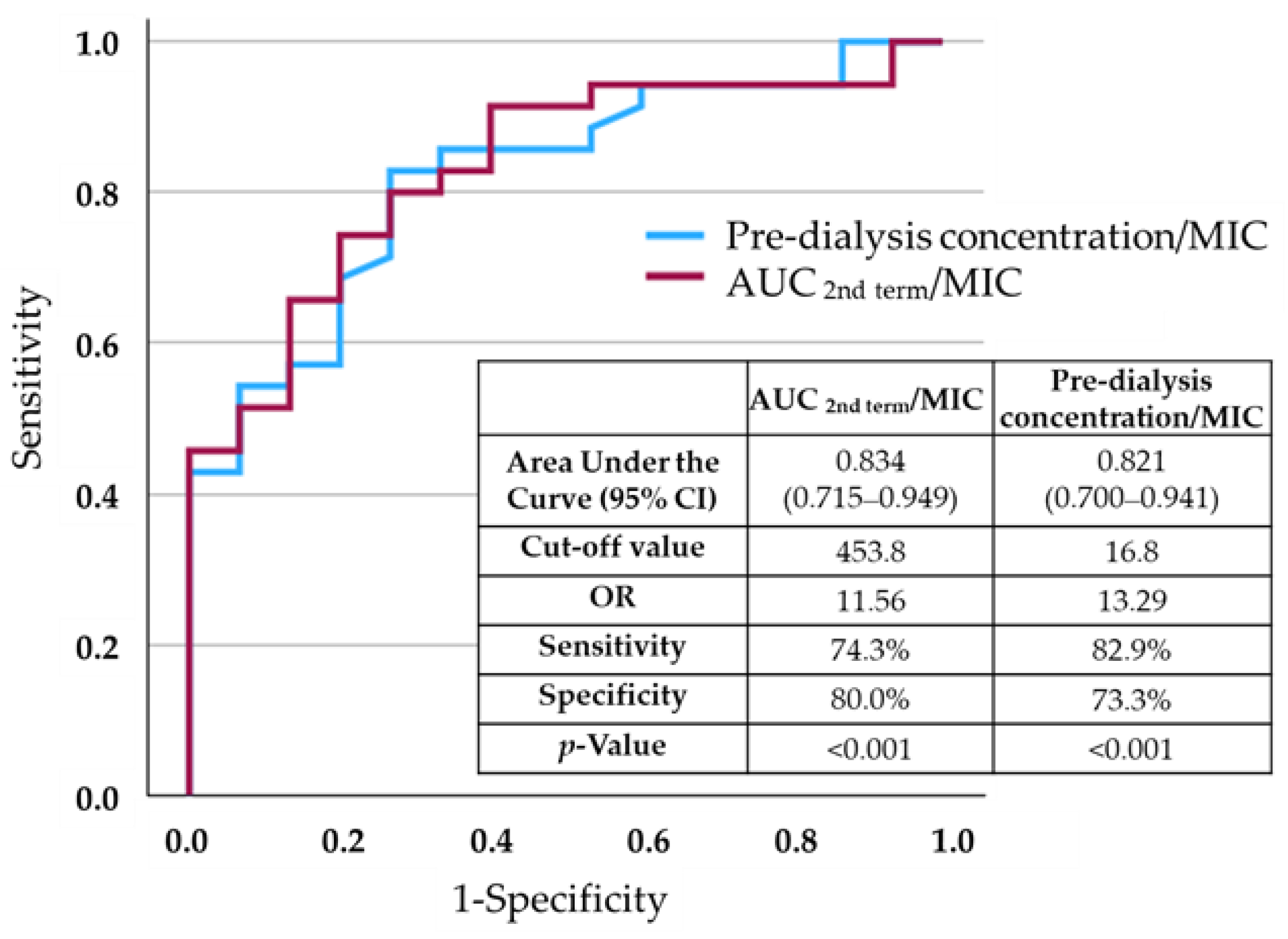 - Fu, C.F.; Huang, J.D.; Wang, J.T.; Lin, S.W.; Wu, C.C. The ratio of pre-dialysis vancomycin trough serum concentration to minimum inhibitory concentration is associated with treatment outcomes in methicillin-resistant Staphylococcus aureus bacteremia. PLoS ONE 2018, 13, e0193585. [Google Scholar] [CrossRef]