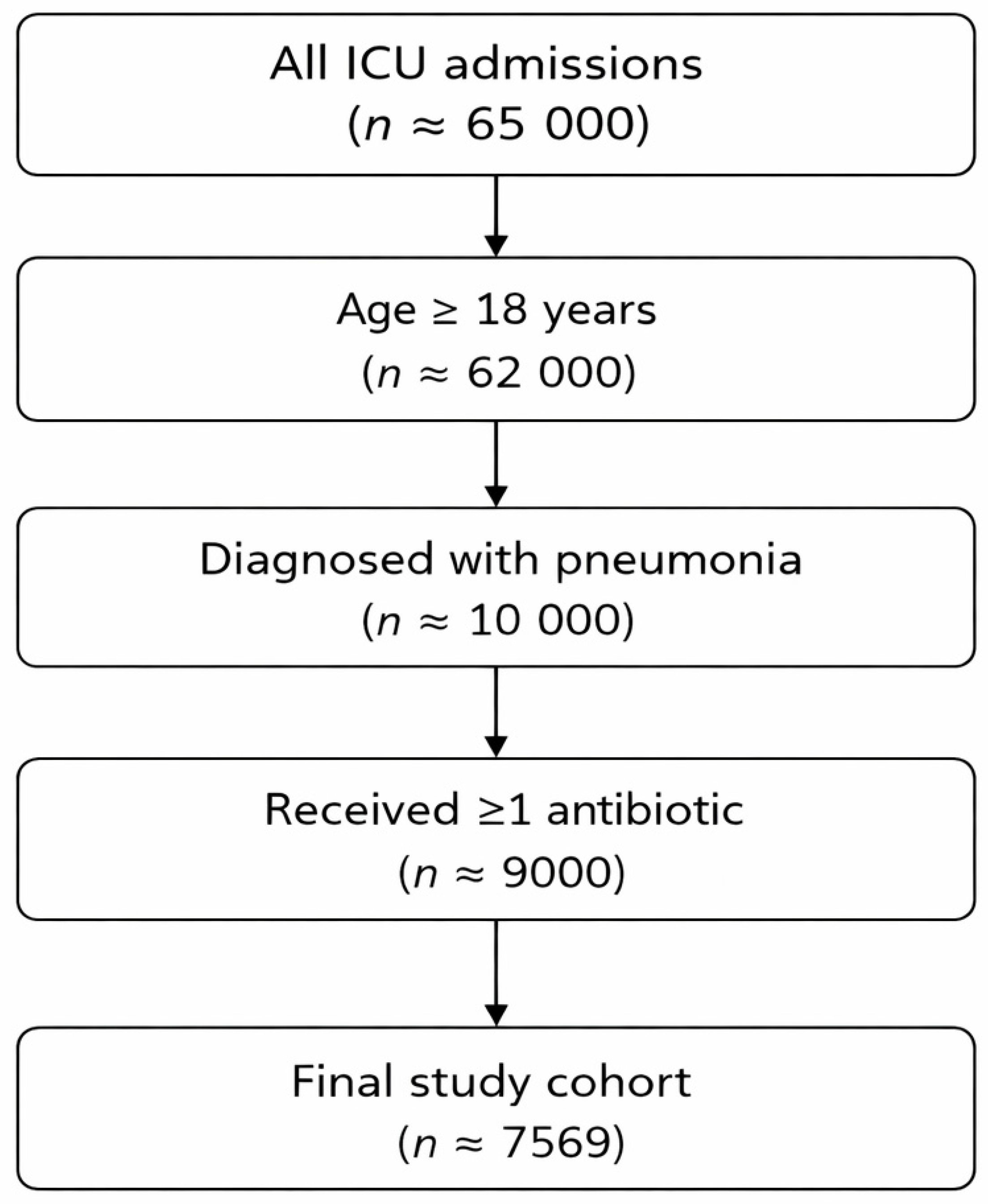 Flowchart of patient inclusion. Flowchart illustrating the selection of the final study cohort from the Medical Information Mart for Intensive Care IV (MIMIC-IV) database. After applying age eligibility (≥18 years), diagnosis-based case identification, documentation of at least one intensive care unit (ICU)-recorded antibiotic administration, and data completeness criteria, the final analytic cohort comprised 7569 patients admitted to the ICU with pneumonia. Because cohort assembly relied on administrative coding and electronic timestamps, diagnostic misclassification and selection bias cannot be fully excluded.