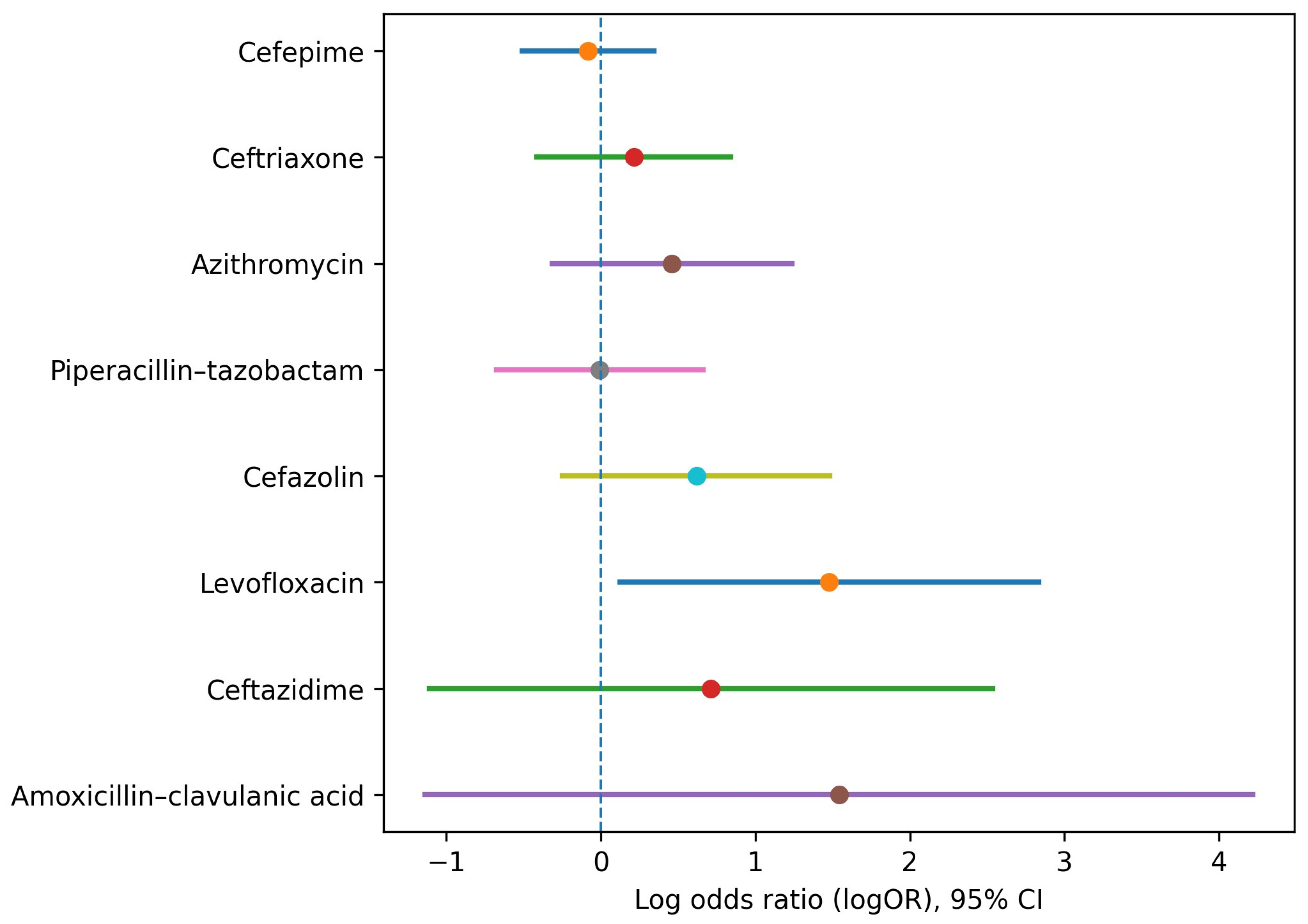 Coefficient plot of antibiotic-specific associations with in-hospital mortality (≥3 vs. <3 doses). This coefficient plot displays the estimated log odds ratios (logORs) with 95% confidence intervals (CIs) for in-hospital mortality associated with receiving ≥3 versus <3 doses of the eight most frequently prescribed antibiotics in patients admitted to the intensive care unit (ICU). All estimates are derived from univariable analyses and represent downstream exposure. Because patients must survive long enough to receive multiple doses, the displayed associations are subject to substantial survivorship and indication bias and should be interpreted as exploratory and hypothesis-generating only. The vertical dashed line at logOR = 0 represents no association (odds ratio (OR) = 1). Points to the right of the line indicate higher odds of mortality, whereas points to the left indicate lower odds of mortality.
