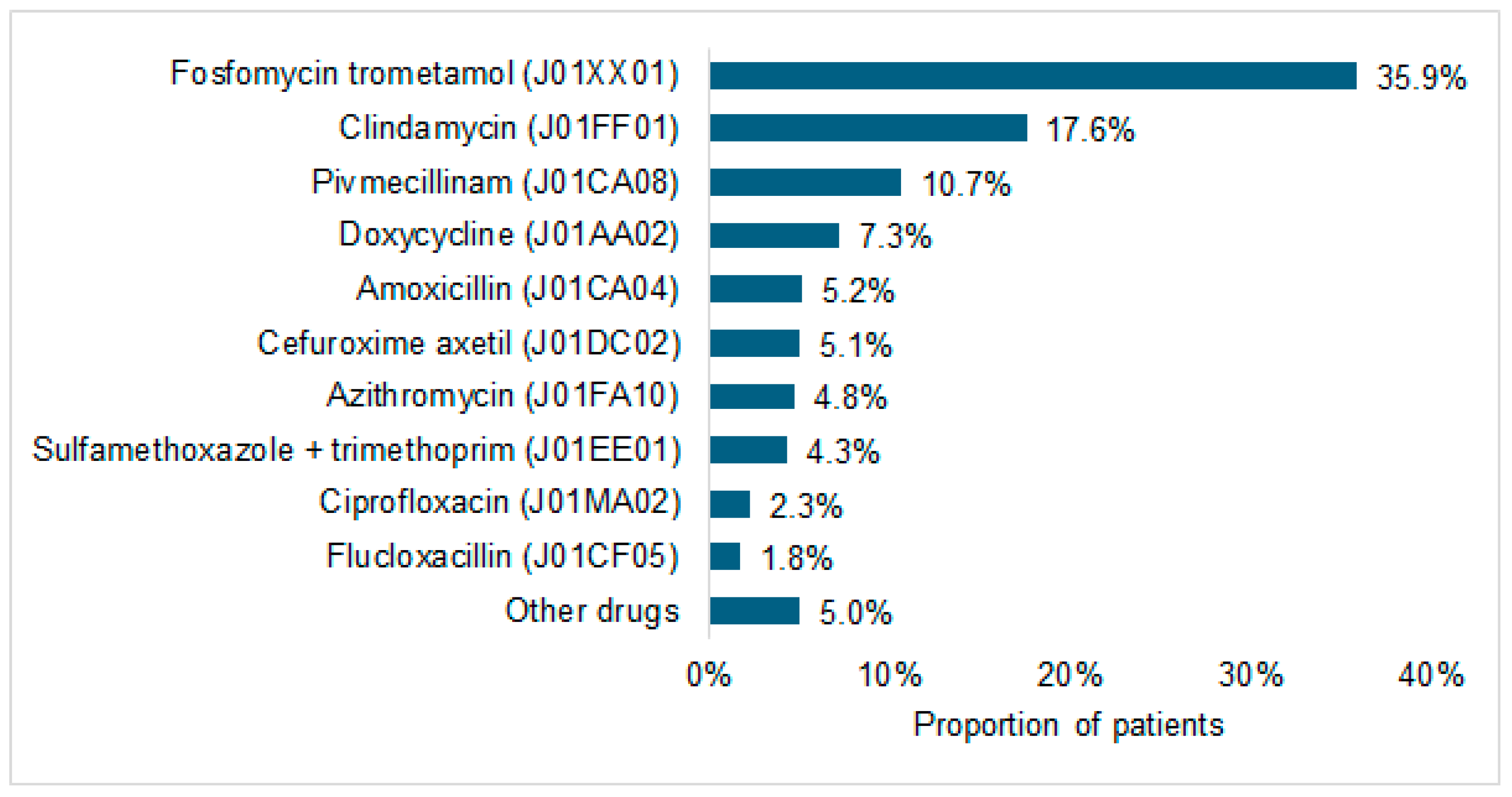 - Schmiemann, G.; Hoffmann, F.; Hamprecht, A.; Jobski, K. Patterns and Trends of Antibacterial Treatment in Patients with Urinary Tract Infections, 2015–2019: An Analysis of Health Insurance Data. BMC Prim. Care 2022, 23, 204. [Google Scholar] [CrossRef] [PubMed]