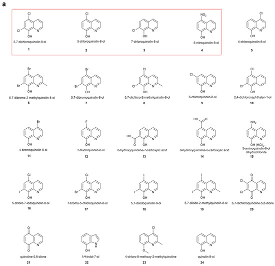 Microbiological screening of selected compounds versus animal pathogens. (a) Structures of screened compounds. (1) 5,7-dichloroquinolin-8-ol, (2) 5-chloroquinolin-8-ol, (3) 7-chloroquinolin-8-ol, (4) 5-nitroquinolin-8-ol (NTX), (5) 4-chloroquinolin-8-ol, (6) 5,7-dibromo-2-methylquinolin-8-ol, (7) 5,7-dibromoquinolin-8-ol, (8) 5,7-dichloro-2-methylquinolin-8-ol, (9) 6-chloroquinolin-8-ol, (10) 2,4-dichloronaphthalen-1-ol, (11) 4-bromoquinolin-8-ol, (12) 5-fluoroquinolin-8-ol, (13) 8-hydroxyquinoline-7-carboxylic acid, (14) 8-hydroxyquinoline-5-carboxylic acid, (15) 5-aminoquinolin-8-ol dihydrochloride, (16) 5-chloro-7-iodoquinolin-8-ol, (17) 7-bromo-5-chloroquinolin-8-ol, (18) 5,7-diiodoquinolin-8-ol, (19) 5,7-diiodo-2-methylquinolin-8-ol, (20) 6,7-dichloroquinoline-5,8-dione, (21) quinoline-5,8-dione, (22) 1H-indol-7-ol, (23) 4-chloro-8-methoxy-2-methylquinoline, (24) quinolin-8-ol. Compounds were from commercial suppliers (Sigma-Aldrich, Inc., St. Louis, MO, USA; Fluorochem Ltd., Derbyshire, United Kingdom; Tokyo Chemical Industries, Tokyo, Japan; MedChem express, Monmouth Junction, NJ, USA) and were used without further purification. Three structurally related hit compounds (5,7-dichloroquinolin-8-ol, 5-chloroquinolin-8-ol, and 7-chloroquinolin-8-ol) and the lead candidate 5-nitroquinolin-8-ol (NTX) are highlighted within a red rectangular box to indicate compounds selected for further evaluation based on shared structural features. (b) Heatmap depicting the antibacterial activities of the selected compounds against test strains under optimised conditions defined in Table S2 (Supplementary Materials). Compound 4, nitroxoline (NTX), is highlighted by two red lines in (b). The colour intensity represents the minimum inhibitory concentration (MIC, µg/mL) as indicated by the key. Empty cells denote missing data. The heatmap was generated using GraphPad Prism 10.0.3.