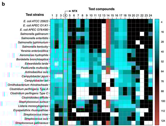 To assess the probability of spontaneous resistance to NTX, twenty-five reference strains (Table S2, Supplementary Materials) were tested to determine their frequency of resistance (FoR) at 2×, 4×, and 8× the MIC, with none of the strains producing resistant mutants under their optimal growth conditions. Ten wild-type strains with diverse antimicrobial resistance phenotypes (five E. coli and five S. enterica isolates; Table S5, Supplementary Materials) were evaluated in FoR analyses. The frequency of spontaneous mutants ranged from 2.0 × 10−7 to 7.0 × 10−6 for E. coli strains and from 1.9 × 10−7 to 6.7 × 10−7 for S. enterica at 2× MIC (8 µg/mL) (Figure 2a; Table S5, Supplementary Materials). However, no mutations were observed at 4× or 8× the MIC in any of the isolates tested (16 and 32 µg/mL, respectively) (Table S5, Supplementary Materials). MICs of NTX-resistant mutants were determined by broth microdilution assays, ranging between 16 and 32 µg/mL (Figure 2b).