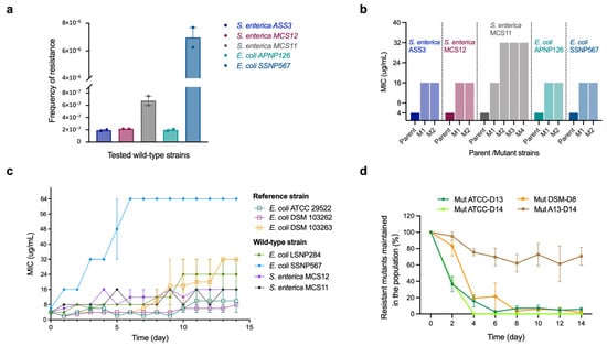 To further evaluate the development of NTX resistance, in vitro serial passage studies were conducted. Three reference strains and four wild-type strains of E. coli and S. enterica were challenged with sub-inhibitory NTX concentrations for 14 consecutive days. Most of the E. coli strains developed resistance gradually, with MICs increasing between 4-fold and 16-fold (Figure 2c). The highest MIC of 64 µg/mL was observed with E. coli SSNP567 after 6 days. A moderate increase in resistance was observed for both S. enterica strains, with MICs rising from 4 to 16 µg/mL after 14 days of NTX exposure (Figure 2c).