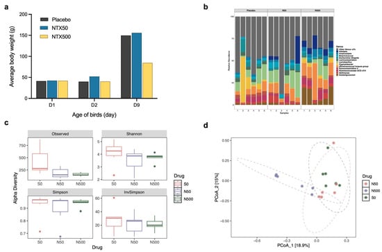 NTX tolerance studies with broilers. (a) Average body weight (BW) of broiler chickens fed with 50 ppm (mg/kg) (blue) or 500 ppm (yellow) NTX for 7 days (days 2–9), compared with the placebo (black, non-supplemented basal diet). Data represent the mean BW of birds in each group (n = 10). (b) Relative abundance of caecal microbiota at the genus level in birds fed with NTX-supplemented diets (50 and 500 ppm) compared to the placebo. Taxa with a relative abundance of <3% were grouped into “Others”. (c) Alpha diversity estimates of the bacterial communities in the caecum of chickens treated with NTX at 50 and 500 mg/kg, compared to a placebo. Box plots of bacterial alpha diversity assessed by Shannon, InvSimpson, Choa1, and Observed indexes, and the three lines from bottom to top are: first quartile, median and third quartile. Whiskers extend from the minimum and maximum values, and dots indicate outliers. Statistical differences were determined by ordinary one-way ANOVA with Dunnett’s multiple comparisons test using GraphPad Prism 10.0.3. (d) Principal coordinate analysis (PCoA) plot comparing the microbial communities (Bray–Curtis dissimilarity) in cecum of chickens treated with NTX. Six birds were randomly selected per group for (b–d). The centroid of each ellipse (dotted line) represents the group mean, while the ellipse shape reflects the covariance (dispersion) of samples within each group.