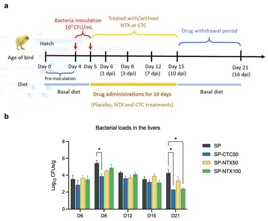 NTX has in vivo antibacterial activity. (a) Experimental design of the efficacy study. Birds were given orally the bacteria inoculum (S. pullorum SP7, 109 CFU/1 mL) on day 4 and 5 of age, then fed diets containing chlortetracycline (CTC, 50 ppm) or NTX (50 and 100 ppm) for 10 days. dpi: days post-infection. (b) Bacterial loads (log CFU/g) in livers. Placebo: non-infected, untreated; SP: infected, untreated; SP-CTC50: infected, treated with 50 ppm CTC; SP-NTX50/100: infected, treated with 50 or 100 ppm NTX. Bars represent mean ± SEM (n = 6). Statistical differences were determined by two-way ANOVA with Dunnett’s multiple comparisons test using GraphPad Prism 10.0.3. Asterisks denote significant differences compared to SP group (*, p < 0.05).