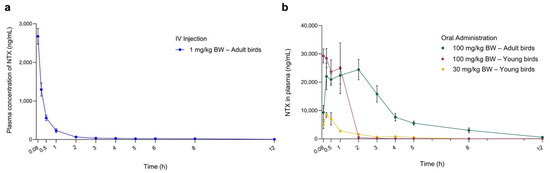 Plasma concentration-time curves of NTX determined in chickens following a single intravenous (IV) injection (a) and oral administration (b) at the indicated doses. Data are presented as mean ± SEM (n = 7) for adult birds receiving 100 mg/kg NTX; n = 6 for all other groups. NTX was not detected at 24, 36 and 48 h in plasma; therefore, only data up to 12 h are presented.