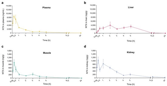 NTX concentration-time curves in plasma (a), liver (b), muscle (c) and kidney (d) following a single oral administration at 30 mg/kg BW. Data are presented as mean ± SEM (n = 6). NTX was not detected at 36 and 48 h in plasma and tissues; therefore, only data up to 24 h are presented.