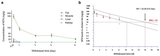 The residual level of antibiotics potentially present in retail meat is a health concern for consumers [65]. When we administered NTX at 100 mg/kg (in feed), the longest residual time was for skin-plus-fat compared to other tissues (muscle, liver, and kidney), with residue levels above the LOQ (10 ng/g) 8 days after drug withdrawal (Figure 7a; Table S10, Supplementary Materials). According to the MRL of NTX from Korea (10 ng/g) [54], the WT for NTX in skin-plus-fat is 17 days in broilers (Figure 7b). Our results show that NTX is eliminated quickly from the liver, kidney, and muscle tissues, but more slowly from fat; however, at the time of slaughter (42 days), levels of NTX are predicted to be <1 ng/g.