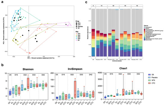 Effect of NTX on caecal microbiome of broiler chickens. Birds were treated with either NTX (100 mg/kg) or CTC (50 mg/kg) continuously for 10 days (days 5–15) and compared with a placebo group (fed a non-supplemented basal diet). 16S ribosomal RNA (rRNA) amplicon sequencing was performed on caecal contents collected on day 5 (n = 10 total) and on days 15, 22, 33, and 42 from six randomly selected broilers per group (n = 1 per replicate). (a) Principal coordinate analysis (PCoA) plot of microbial communities in the caecum at different ages. Analysis was based on Bray–Curtis dissimilarity; samples were grouped according to age. The centroid of each ellipse represents the group mean. (b) Boxplots of alpha diversity as measured by Shannon, InvSimpson, and Chao1 diversity indexes. The box extends from the 25th to 75th percentiles; the index values are presented as the median (central black horizontal line); the whiskers extend from the minimum and maximum values. + represents the mean values of the replicates for each group (n = 10 for day 5, n = 6 per group for all other days). Data from different sampling days are separated by vertical dotted lines. Statistical differences were determined by ordinary one-way ANOVA with Dunnett’s multiple comparisons test using GraphPad Prism 10.0.3. (c) Average relative abundances of microbial community in the cecum at the genus level. Taxa with a relative abundance of <1% were grouped into “Others”.