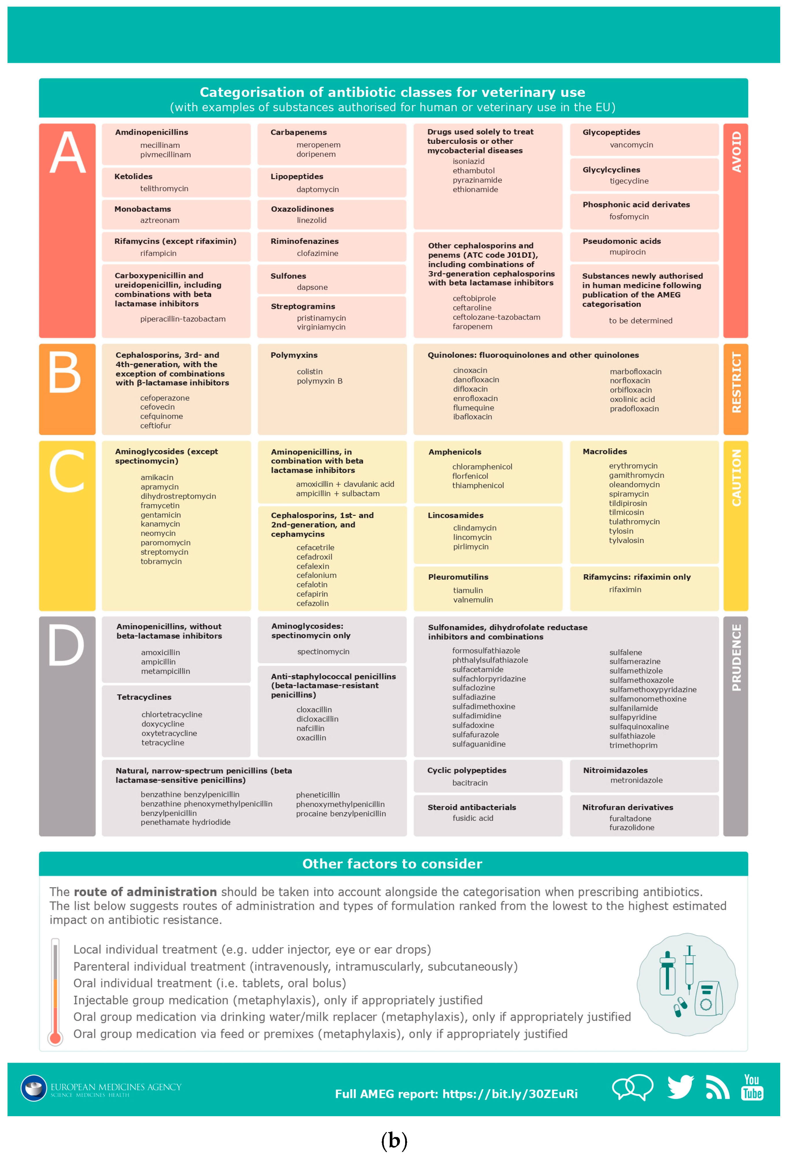 - European Medicine Agency: Infographic on Categorization of Antimicrobials. Available online: https://fve.org/ema-infographics-on-categorization-of-antimicrobials/ (accessed on 10 June 2025).