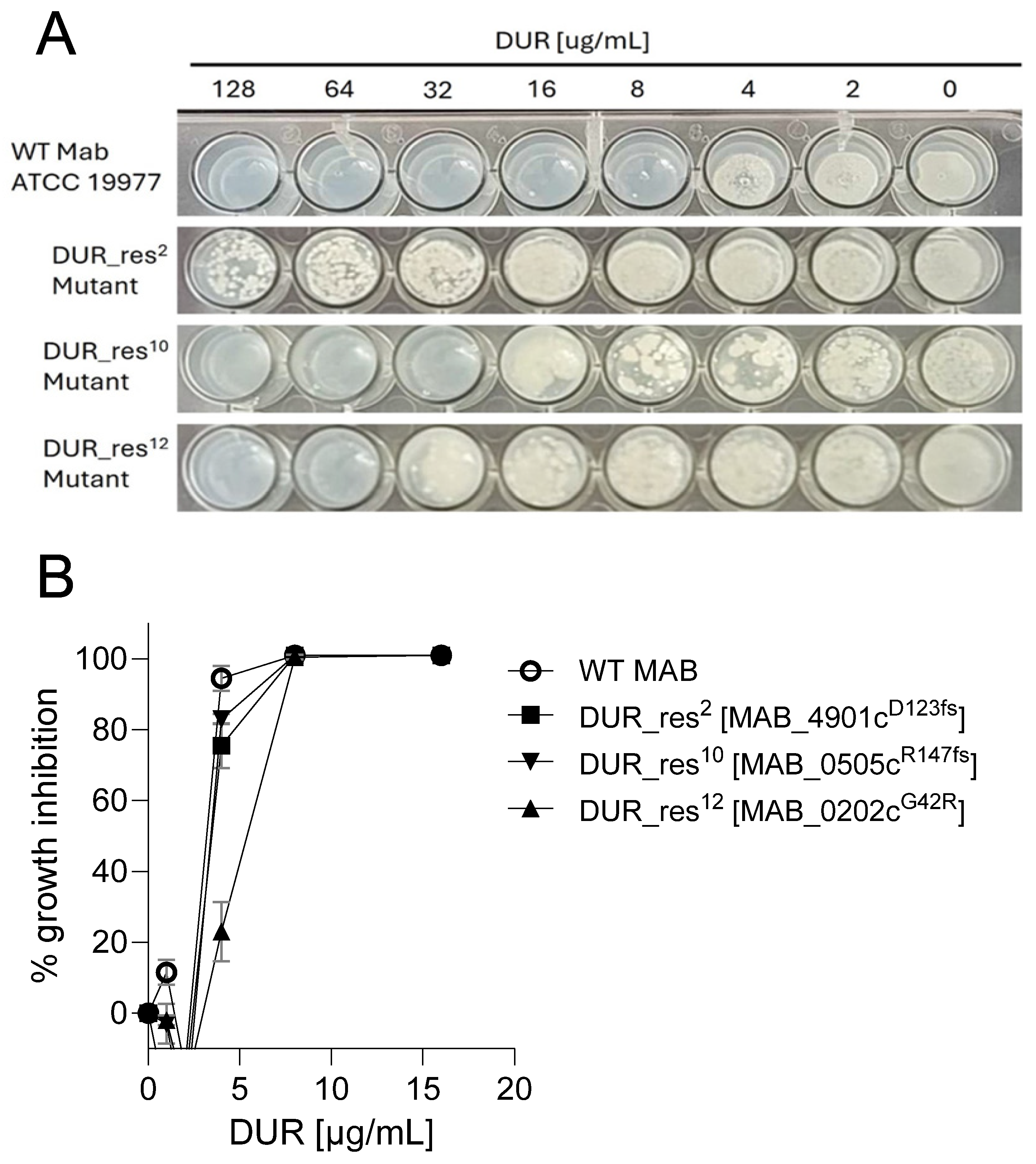 | DUR_res2 | >128 | 8 | Spontaneous DUR resistant ponA1 (MAB_4901c) frameshift mutant (Table 1) |