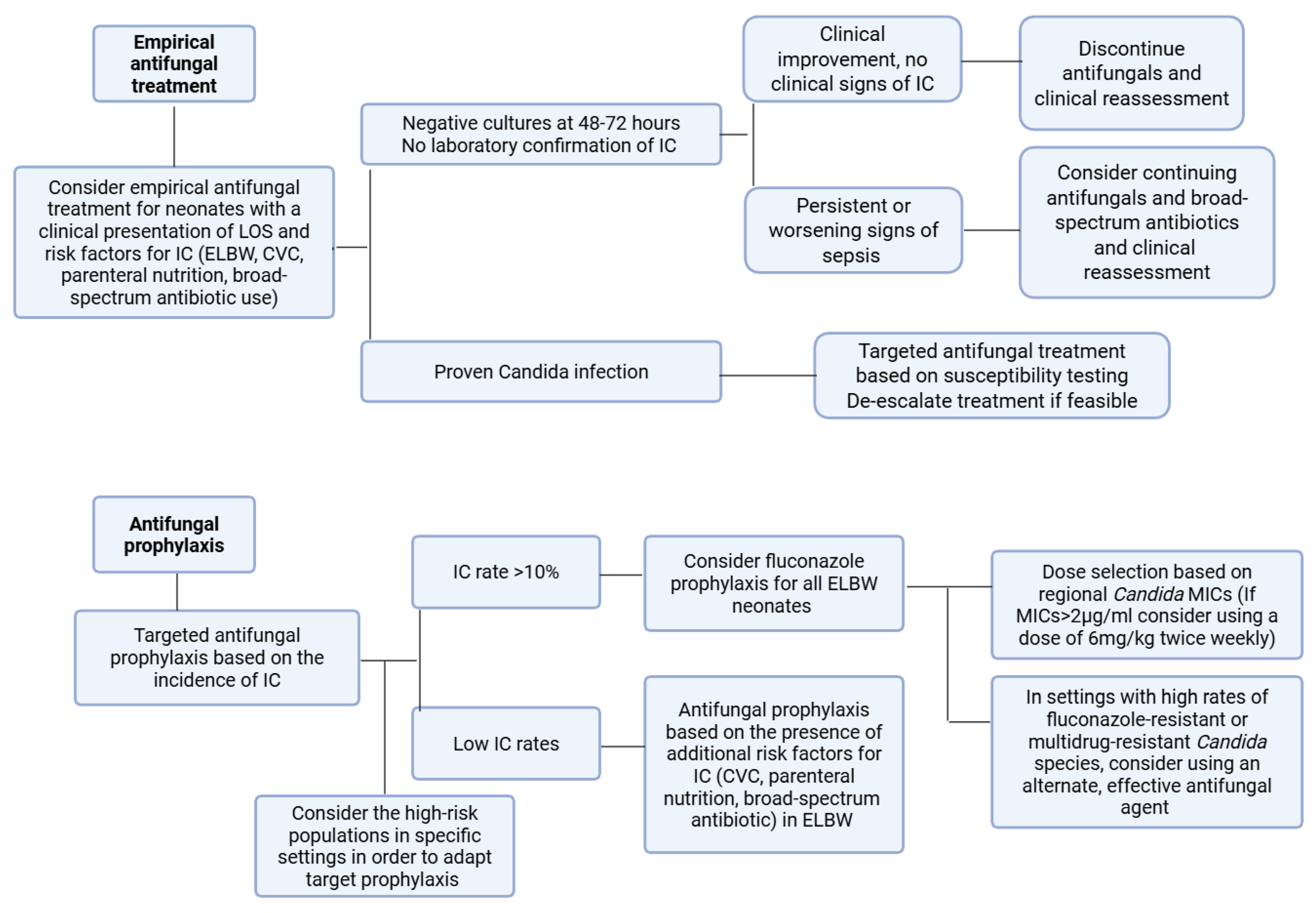 | Fluconazole prophylaxis 3–6 mg/kg iv or per os biweekly for six weeks for all ELBW neonates in NICUs with a high incidence of IC (>10%) (strong recommendation; high-quality evidence) |