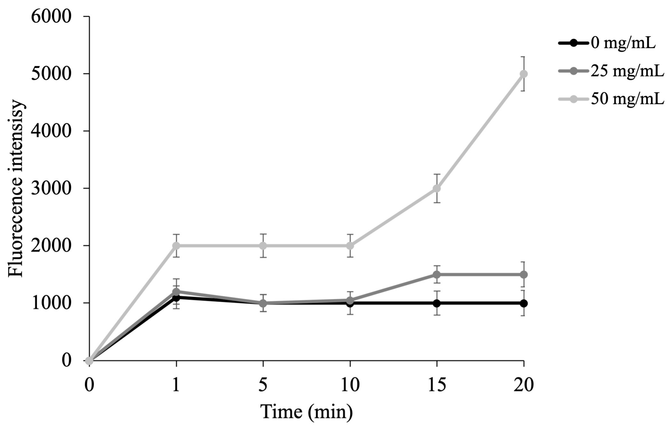 E. coli cultures were incubated overnight under standard growth conditions, then collected by centrifugation, rinsed with PBS, and resuspended in 5 mM HEPES buffer (pH 7.2) until reaching an optical density of 0.5 ± 0.02 at 600 nm. For each experimental condition, 50 µL of the test sample (used at concentrations corresponding to the MIC and twice the MIC) was mixed with 100 µL of the bacterial suspension in black 96-well fluorescence microplates. Subsequently, 50 µL of a 40 µM NPN solution was added. Control wells consisted of bacterial cells and NPN in HEPES buffer without As. Fluorescence was measured at excitation and emission wavelengths of 350 nm and 420 nm, respectively, using a microplate fluorimeter. The increase in fluorescence intensity was used as an indicator of OM permeabilization.