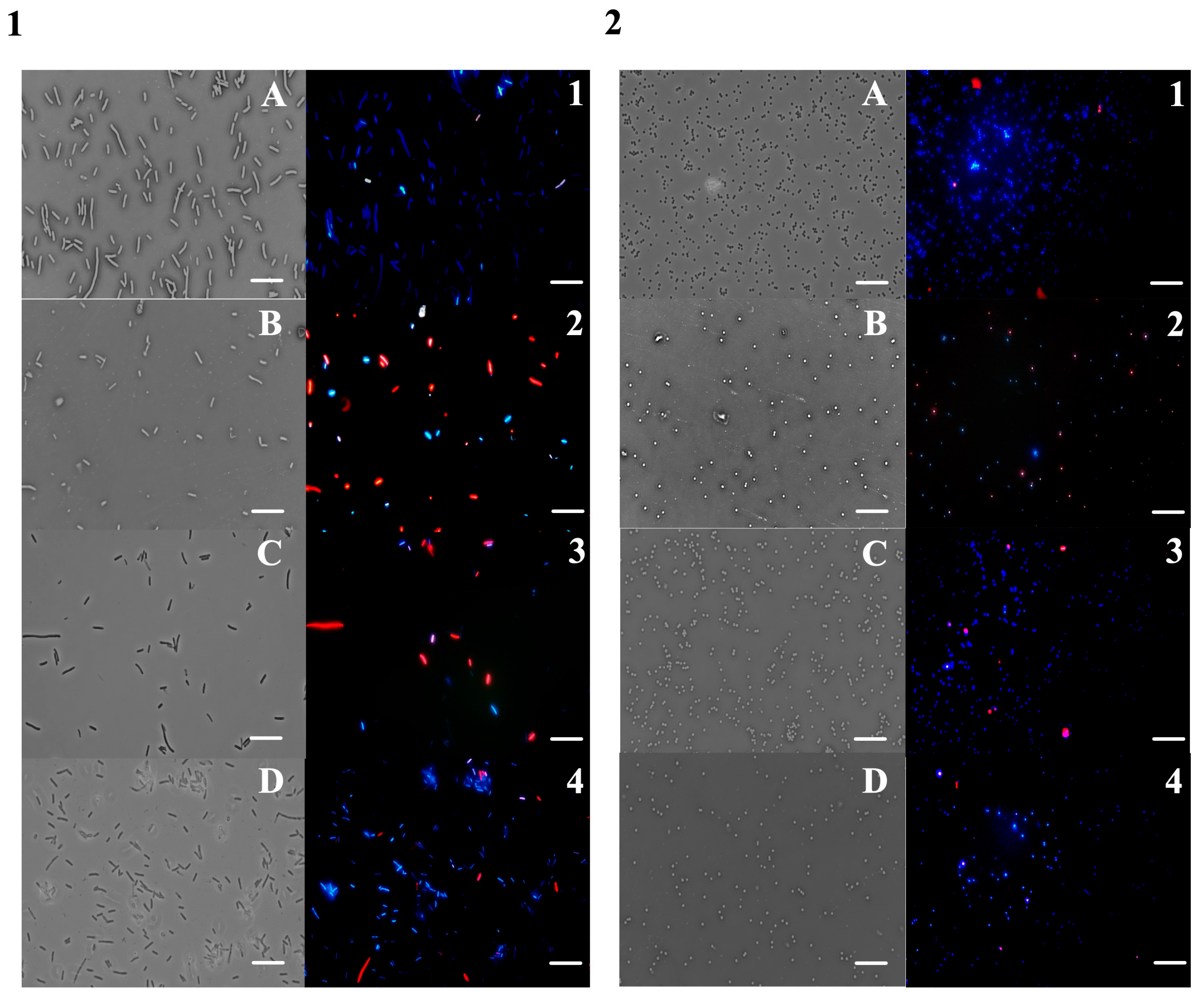 The integrity of the bacterial inner membrane (IM) was evaluated by fluorescence microscopy using DAPI (4′,6-diamidino-2-phenylindole dihydrochloride; Sigma-Aldrich, Milan, Italy) and propidium iodide (PI; Sigma-Aldrich, Milan, Italy), following the method described by Di Girolamo et al. [