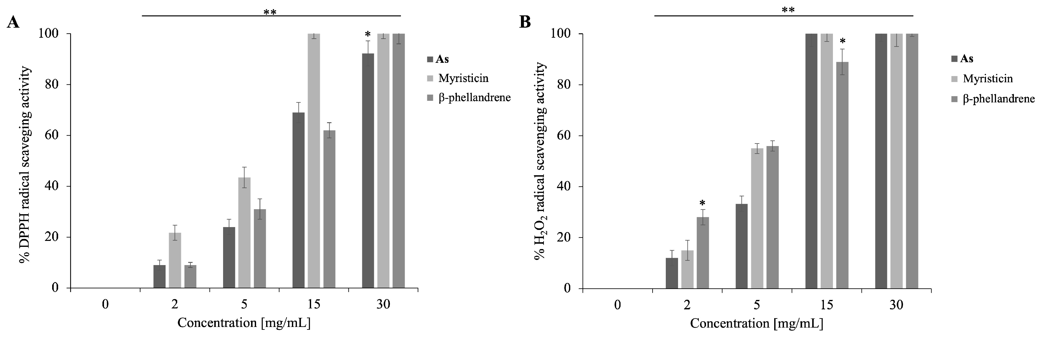 As and its individual components, was evaluated through two complementary assays: DPPH radical scavenging and hydrogen peroxide scavenging, following the methodology described by Napolitano et al. For both assays, a range of concentrations (0–30 mg/mL) was prepared in a final reaction volume of 1 mL [