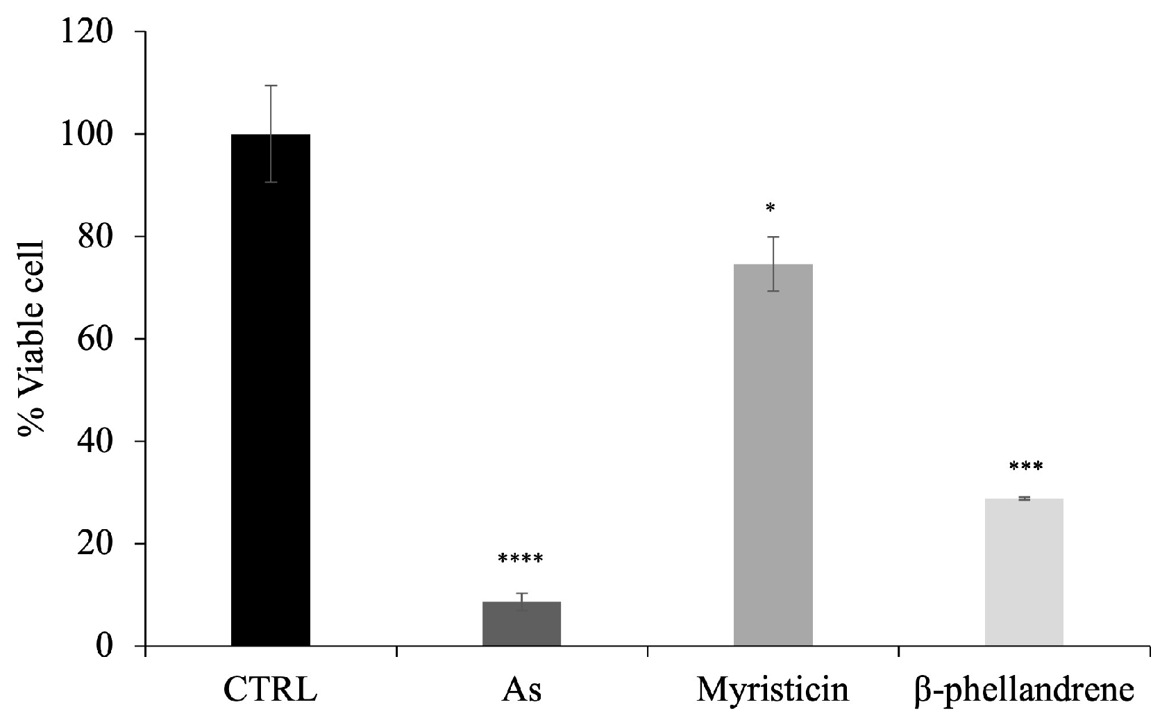 The antimicrobial activity of As, myristicin and β-phellandrene was evaluated against different strains Gram-negative such as: Escherichia coli DH5α, Pseudomonas aeruginosa PAO1 ATCC15692 and Salmonella typhimurium ATCC14028; Gram-positive such as: Staphylococcus aureus ATCC6538P, Bacillus subtilis AZ54, Listeria monocytogenes ATCC 19115 and Mycobacterium smegmatis MC2155 and the yeast Candida albicans ATCC14053. E. coli and S. aureus were used as model strains.