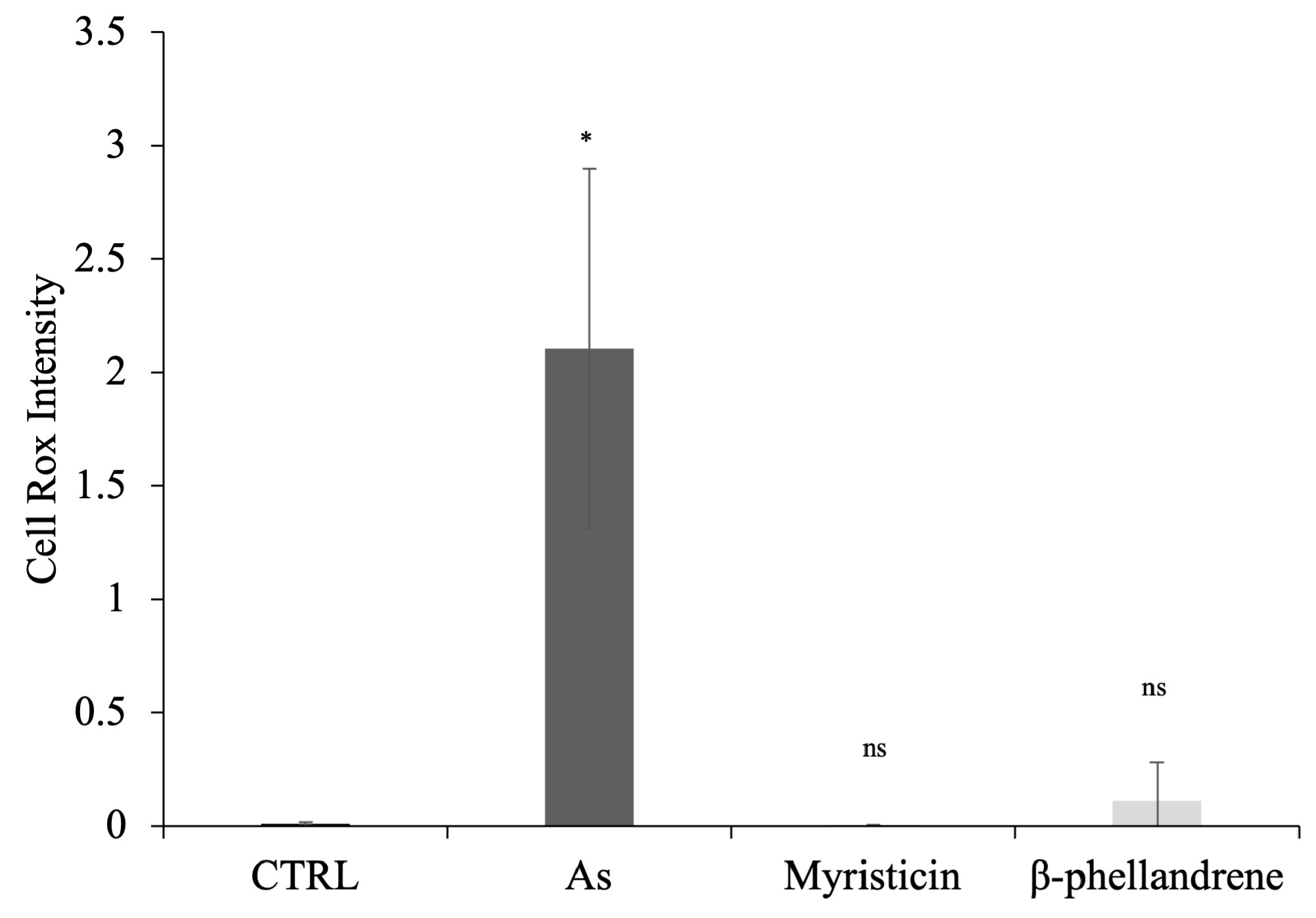 HaCaT cells were seeded into 96-well plates. 24 h after seeding, cells were treated with As, myristicic, and β-phellandrene for 24 h, at the indicated concentrations, followed by CellROX Green Reagent fluorogenic probe detection for measuring oxidative stress in live cells (C10444, Invitrogen, Waltham, MA, USA). Cells were incubated for 30 min at 37 °C in the dark with media containing 5 mM of CellROX solution. Afterward, medium was replaced with fresh medium. Then absorbance at 488 nm was determined using CellDiscoverer CD7 (ZEISS, Oberkochen, Germany).
