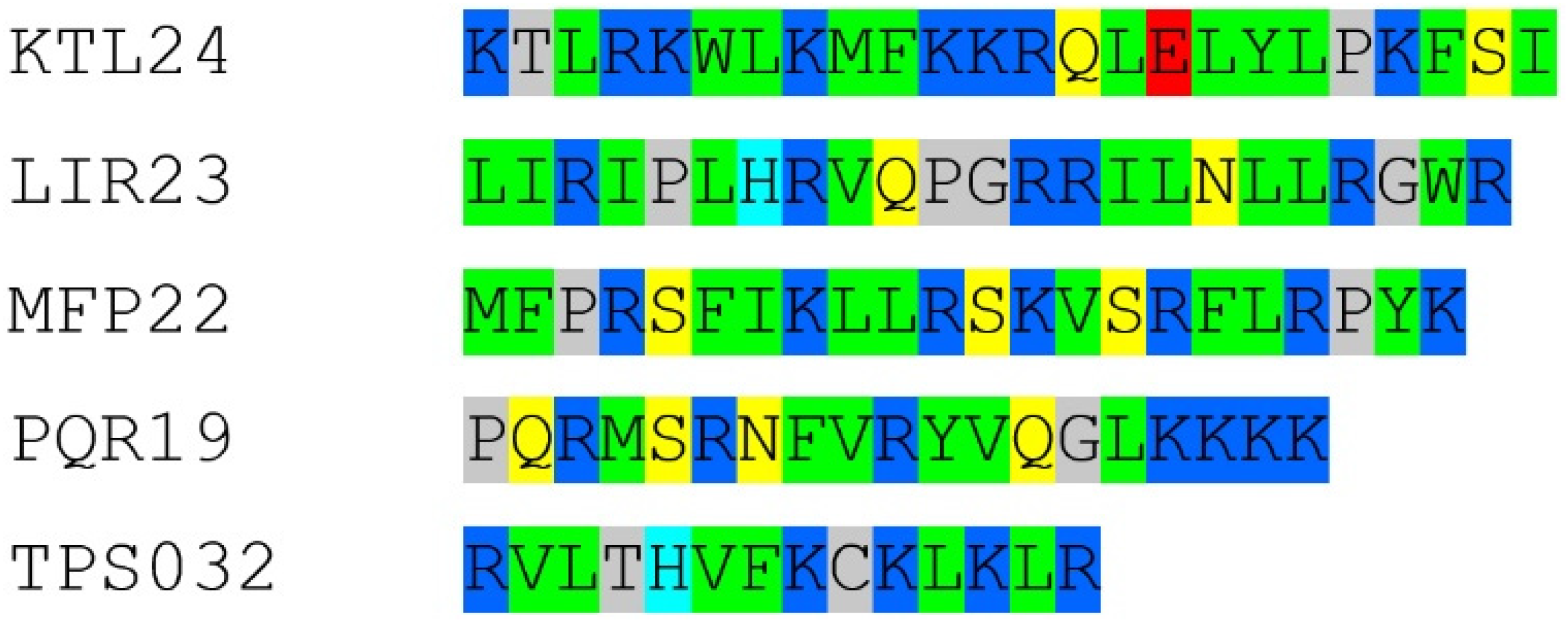 The peptides KTL24, 3095.88 g/mol (KTLRKWLKMFKKRQLELYLPKFSI); PQR19, 2363.86 g/mol (PQRMSRNFVRYVQGLKKKK); MFP22, 2770.42 g/mol (MFPRSFIKLLRSKVSRFLRPYK); LIR23, 2833.47 g/mol (LIRIPLHRVQPGRRILNLLRGWR) and TPS032, 1741.24 g/mol (RVLTHVFKCKLKLR) were all purchased from Caslo ApS (Kongens Lyngby, Denmark). All peptides were provided with a certificate of analysis and were characterized by mass spectrometry (MS) by the manufacturer. The experimentally determined molecular masses corresponded to the theoretical values. Peptide purity was ≥95%, as reported by the supplier.